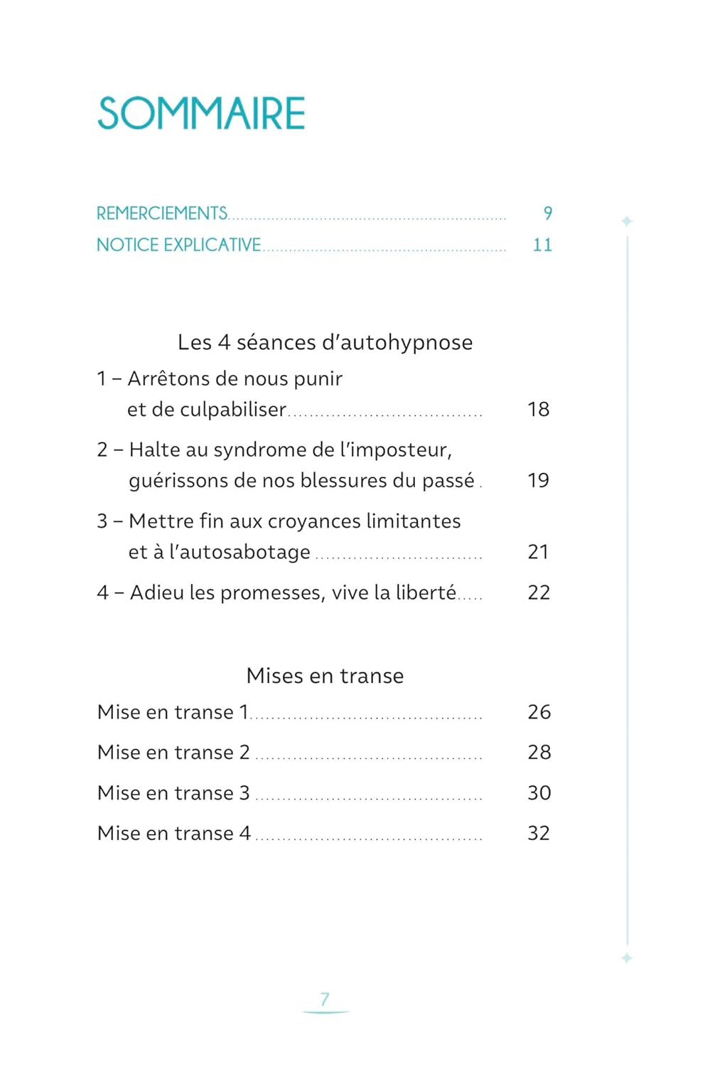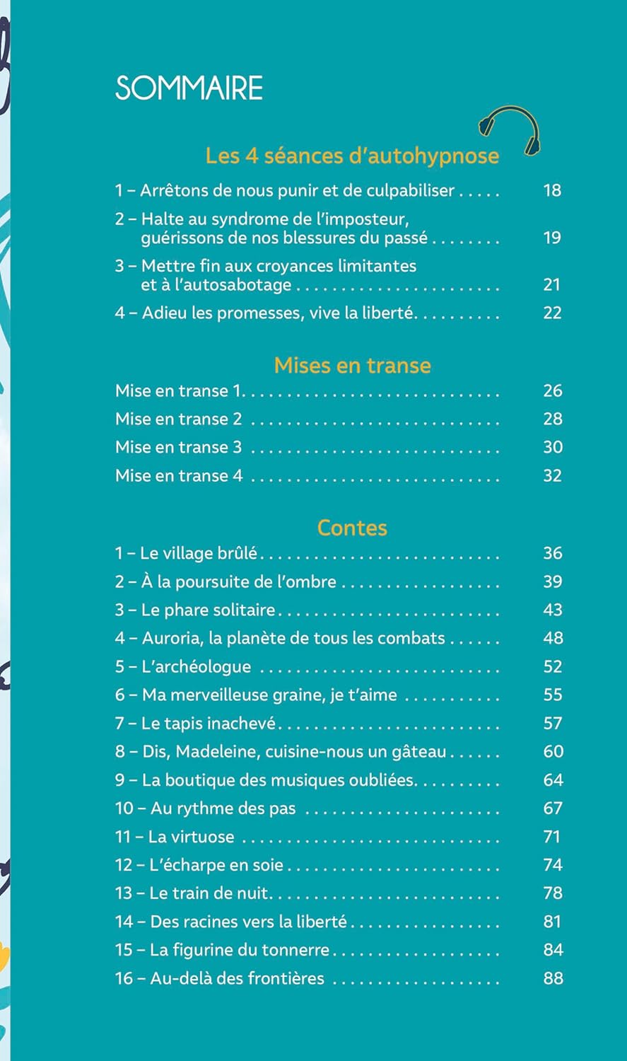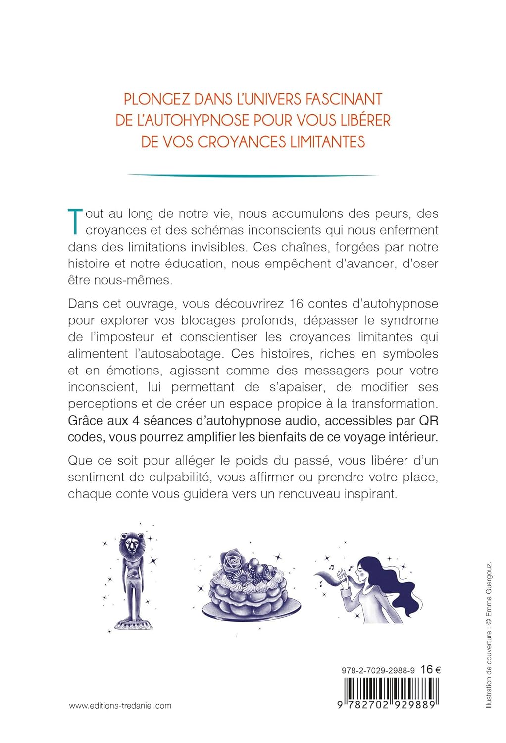 Dans cet ouvrage, vous découvrirez 16 contes d'autohypnose pour explorer vos blocages profonds, dépasser le syndrome de l'imposteur et conscientiser les croyances limitantes qui alimentent l'autosabotage. Ces histoires, riches en symboles et en émotions, agissent comme des messagers pour votre inconscient, lui permettant de s'apaiser, de modifier ses perceptions et de créer un espace propice à la transformation. Grâce aux 4 séances d'autohypnose audio, accessibles par QR codes, vous pourrez amplifier les bienfaits de ce voyage intérieur.