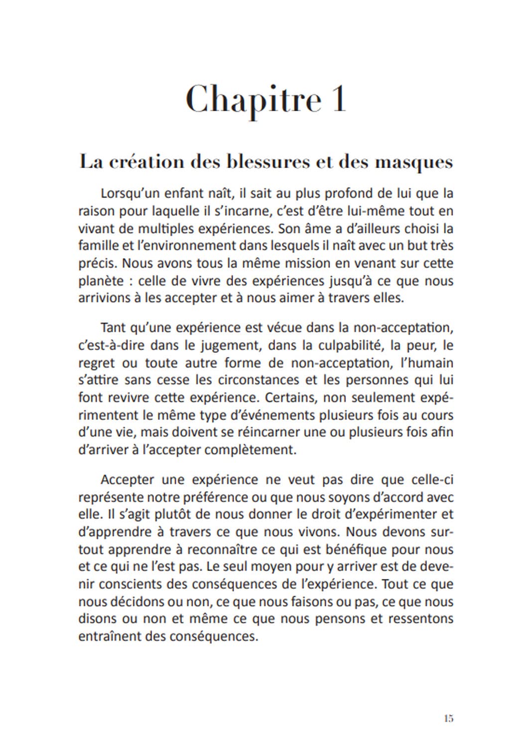 Ce nouveau livre de Lise Bourbeau, aussi concret que les précédents, démontre que tous les problèmes d'ordre physique, émotionnel ou mental proviennent de cinq blessures importantes : le rejet, l'abandon, l'humiliation, la trahison et l'injustice. Grâce à la description très détaillée de ces blessures et des masques que vous avez développés pour ne pas les voir, les sentir et surtout pour ne pas les connaître, vous arriverez à identifier la vraie cause d'un problème précis dans votre vie. Ces masques vous donneront également des réponses sur l'extrême maigreur ou grosseur des gens.