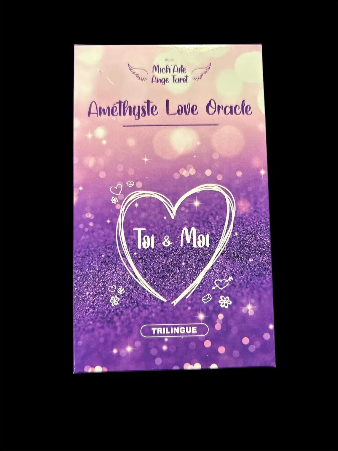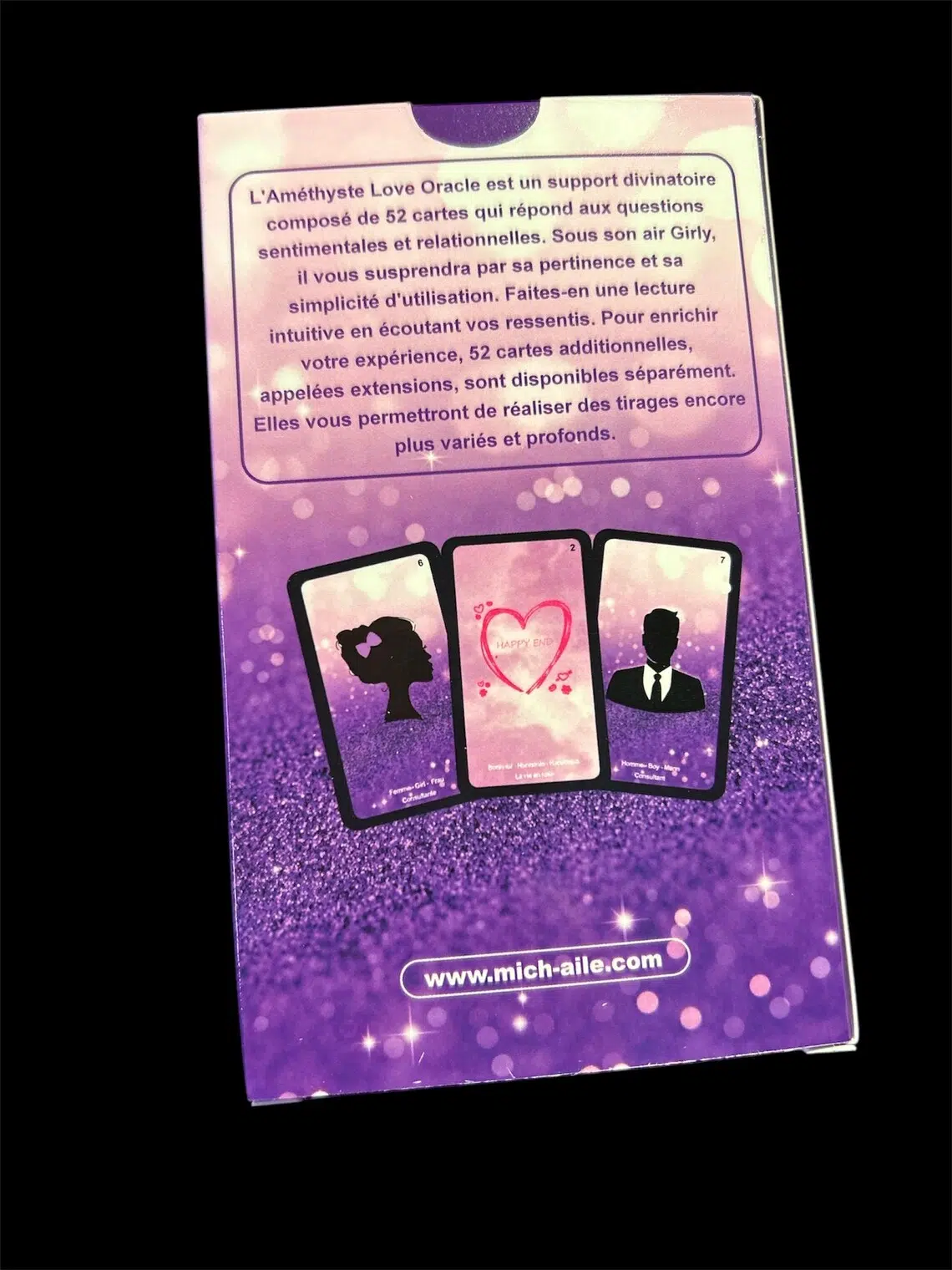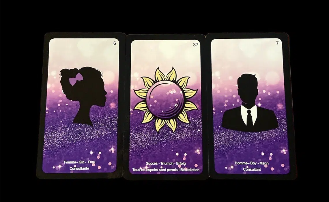 Ce best-seller auto édité est un jeu de 52 cartes très apprécié. Sa spécificité est de donner des réponses claires et précises à toutes vos questions affectives, sentimentales et relationnelles. Les cartes sont extrêmement intuitives, en plus d’être annotées de mots clés en trois langues (français, anglais et allemand), et permets de réaliser des tirages éloquents. Trois extensions sont même disponibles (poussant le jeu jusqu’à un total de 89 cartes) pour encore plus de précisions et de nuances. Un allié de choix pour ce thème si important, accessible tant aux amateurs qu’utile aux professionnels de la voyance.
