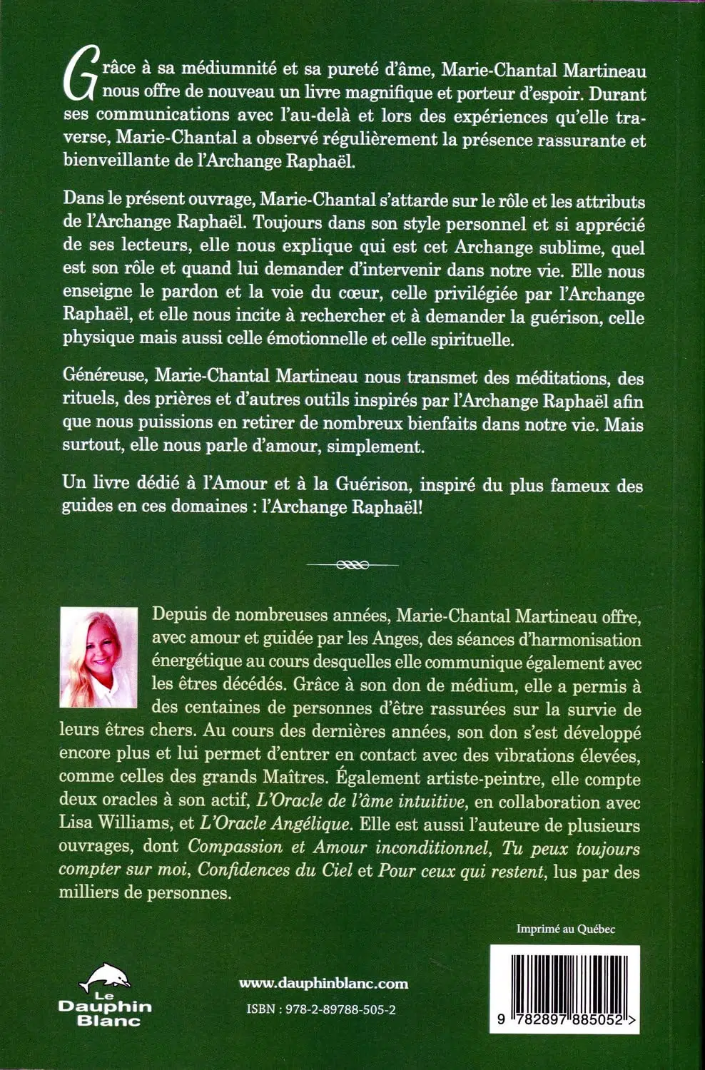 Grâce à sa médiumnité et sa pureté d’âme, Marie-Chantal Martineau nous offre de nouveau un livre magnifique et porteur d’espoir. Durant ses communications avec l’au-delà et lors des expériences qu’elle traverse, Marie-Chantal a observé régulièrement la présence rassurante et bienveillante de l’Archange Raphaël.
