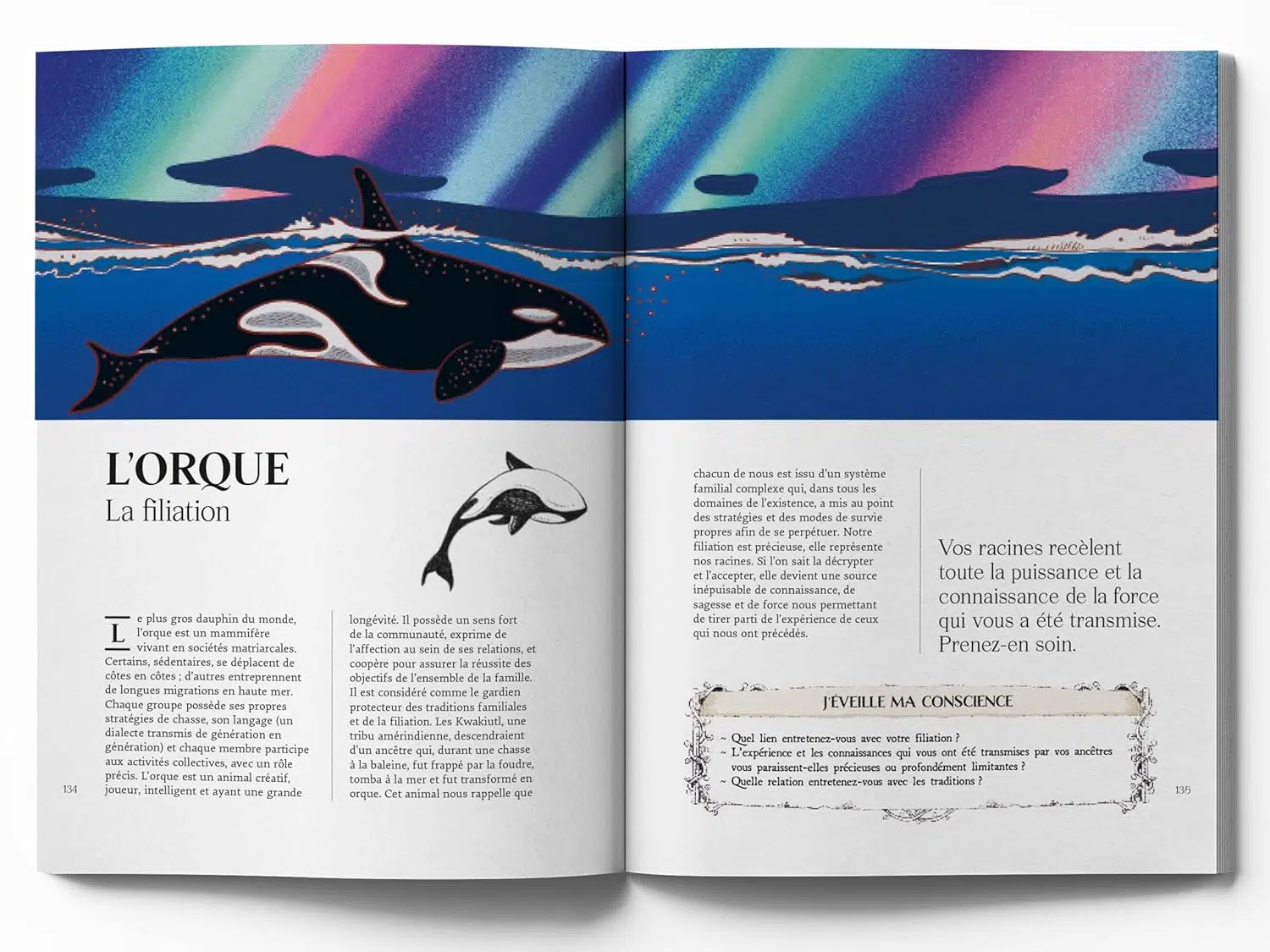 Animaux de l’air, de la terre, de l’eau ou imaginaires, tous marchent à nos côtés et incarnent des dons ouverts au monde, dans lesquels nous pouvons puiser notre énergie.