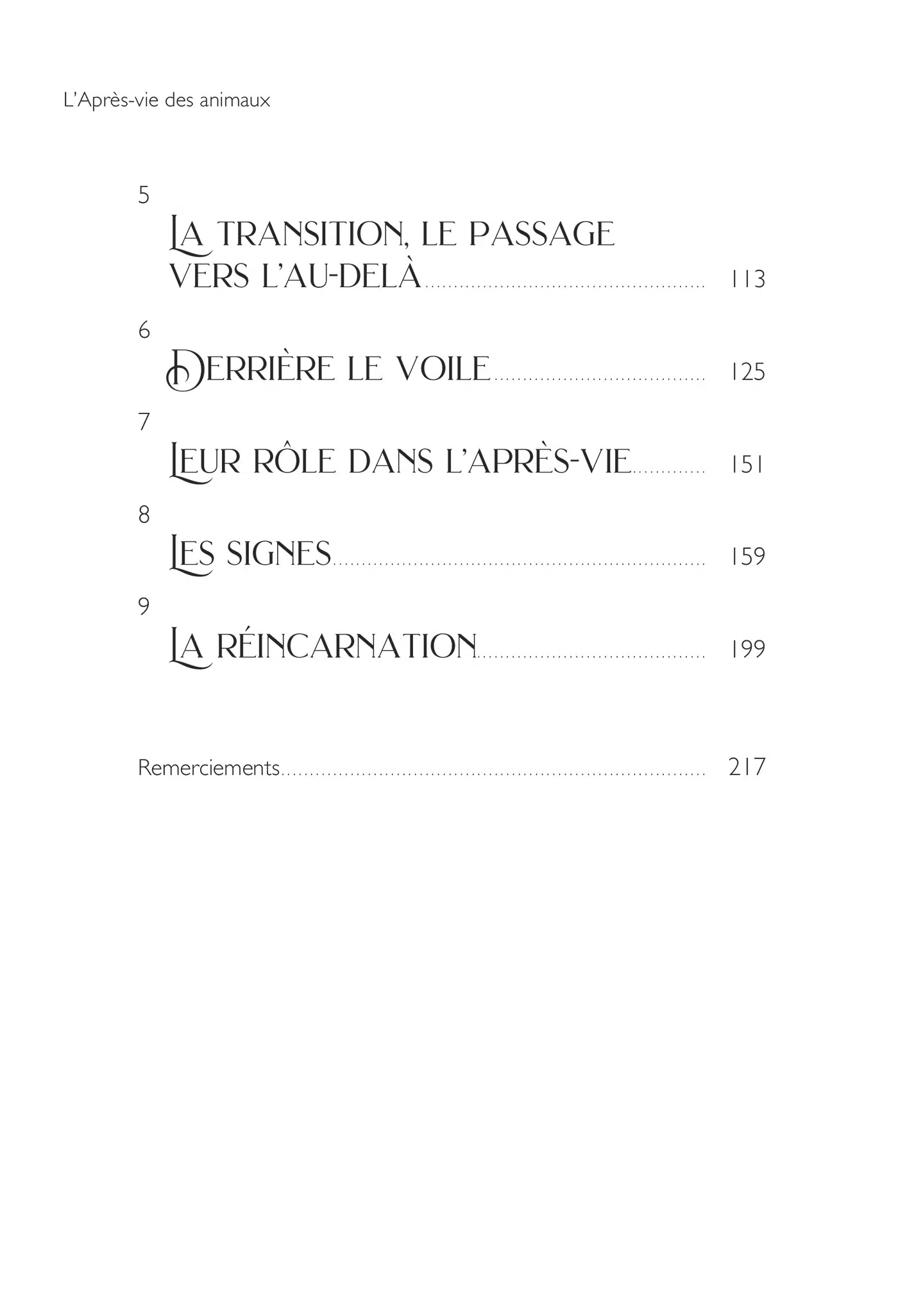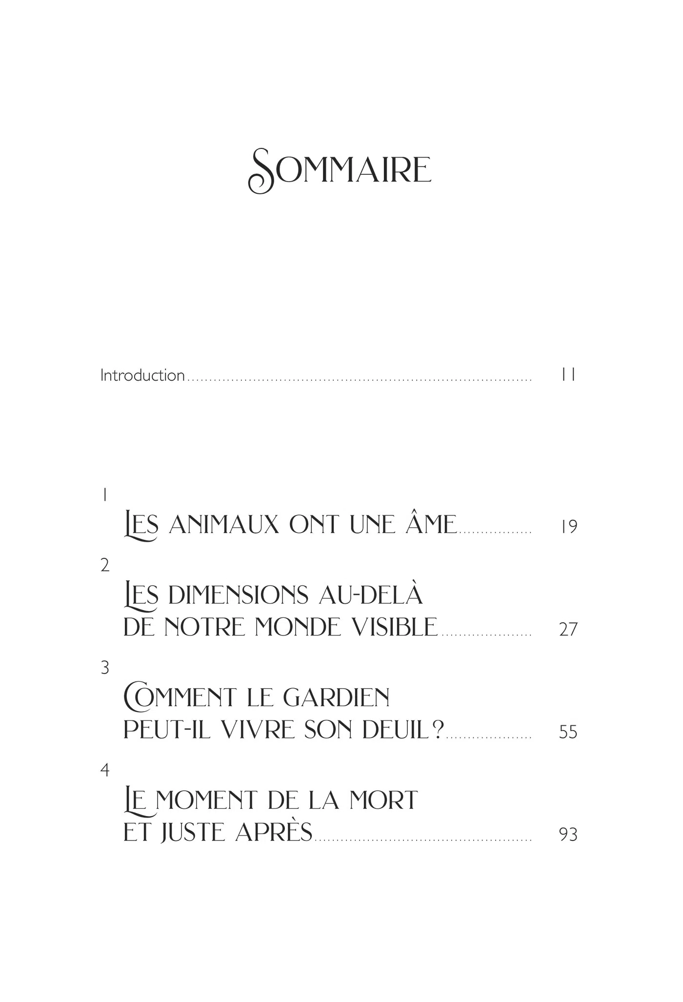 Elle nous rappelle ici qu’il est important d’être à leur écoute, de ressentir leurs besoins et leurs douleurs éventuelles quand ils arrivent au bout de leur chemin. Elle aborde ainsi les questions délicates de l’euthanasie et celle de la culpabilité que peut ressentir le gardien de l’animal pendant son processus de deuil. Médium aux perceptions extrasensorielles hors norme, elle nous aide à traverser au mieux ces moments difficiles et nous explique qu’après leur passage, l’âme des animaux défunts est accueillie par des Êtres de lumière et continue d’évoluer dans des dimensions invisibles.