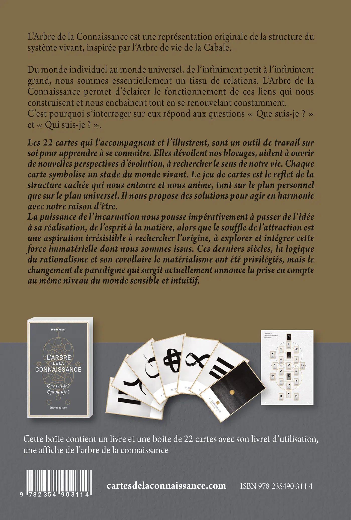 Les 22 cartes qui l’accompagnent et l’illustrent, sont un outil de travail sur soi pour apprendre à se connaître. Elles dévoilent nos blocages, aident à ouvrir de nouvelles perspectives d’évolution, à rechercher le sens de notre vie. Chaque carte symbolise un stade du monde vivant. Le jeu de cartes est le reflet de la structure cachée qui nous entoure et nous anime, tant sur le plan personnel que sur le plan universel. Il nous propose des solutions pour agir en harmonie avec notre raison d’être.