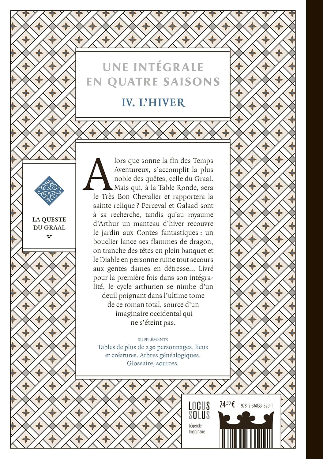 Alors que sonne la fin des Temps Aventureux, s’accomplit la plus noble des quêtes, celle du Graal. Mais qui, à la Table Ronde, sera le Très Bon Chevalier et rapportera la sainte relique ? Perceval et Galaad sont à sa recherche, tandis qu’au royaume d’Arthur un manteau d’hiver recouvre le jardin aux Contes fantastiques : un bouclier lance ses flammes de dragon, on tranche des têtes en plein banquet et le Diable en personne ruine tout secours aux gentes dames en détresse… Livré pour la première fois dans son intégralité, le cycle arthurien se nimbe d’un deuil poignant dans l’ultime tome de ce roman total, source d’un imaginaire occidental qui ne s’éteint pas.