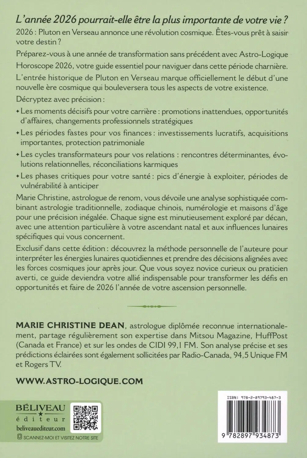 Marie Christine Dean, astrologue de renom, vous dévoile une analyse sophistiquée combinant astrologie traditionnelle, zodiaque chinois, numérologie et maisons d’âge pour une précision inégalée. Chaque signe est minutieusement exploré par décan, avec une attention particulière à votre ascendant natal et aux influences lunaires spécifiques qui vous concernent.