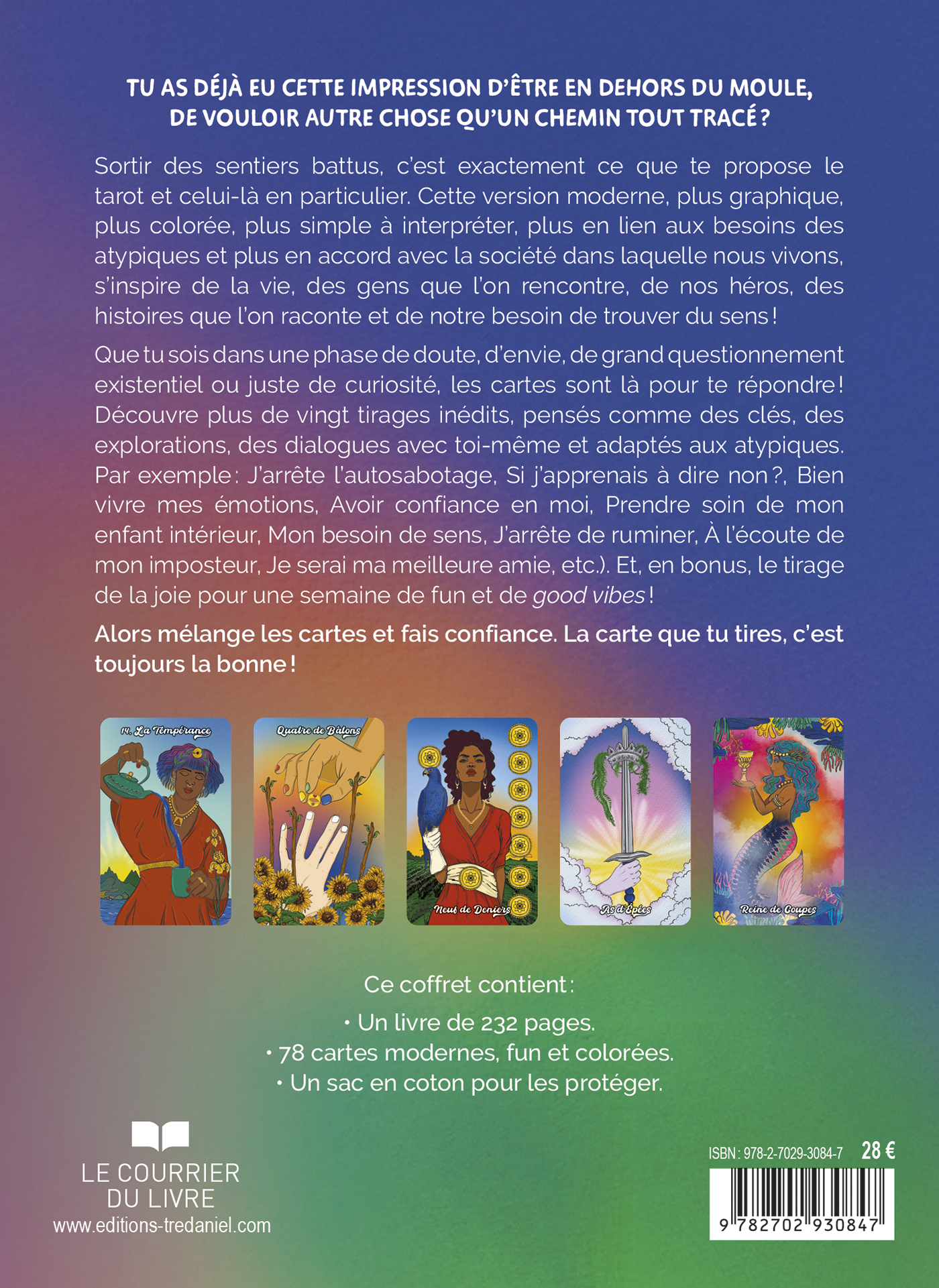 Sortir des sentiers battus, c’est exactement ce que te propose le tarot et celui-là en particulier. Cette version moderne, graphique, colorée, simple à interpréter, en lien avec les besoins des hypersensibles, multipotentiels, atypiques et en accord avec la société dans laquelle nous vivons, s’inspire de la vie, des gens que l’on rencontre, de nos héros, des histoires que l’on raconte et de notre besoin de trouver du sens et d’être utile.
