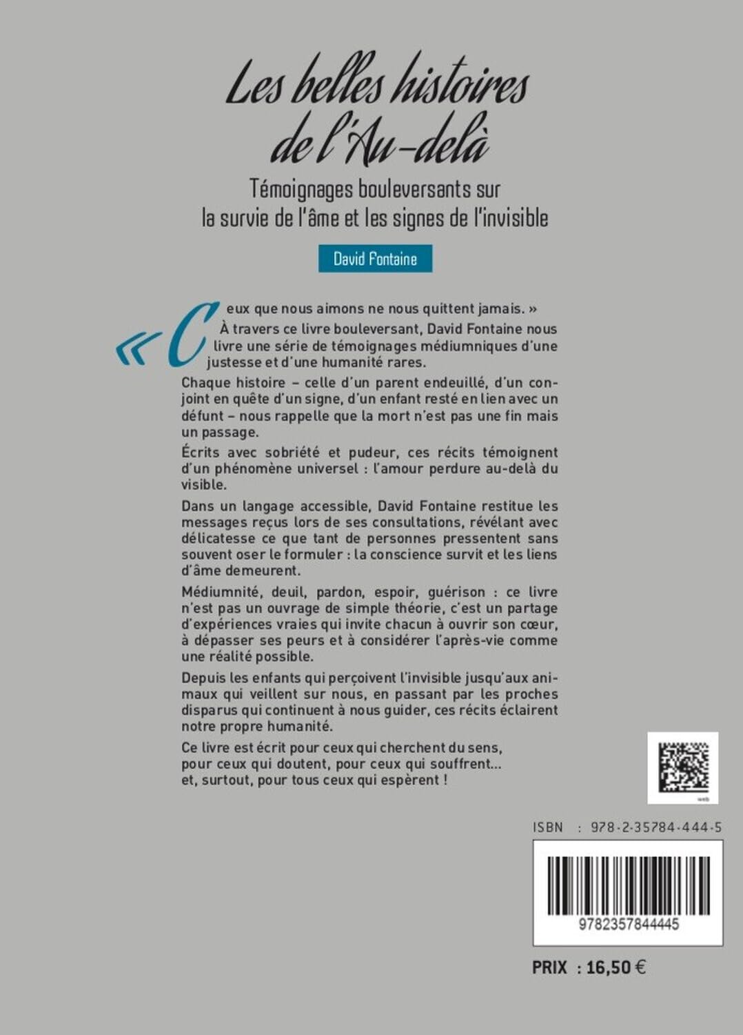 Dans Les belles histoires de l’Au-delà, David Fontaine partage des récits bouleversants recueillis au fil de ses expériences médiumniques. Avec simplicité et sincérité, il nous invite à découvrir une série de témoignages authentiques, souvent touchants, parfois déconcertants, toujours porteurs d’espoir. Ni dogmatique, ni sensationnaliste, l’auteur assume une posture singulière : celle d’un médium qui garde les pieds sur terre tout en tendant la main vers l’invisible.