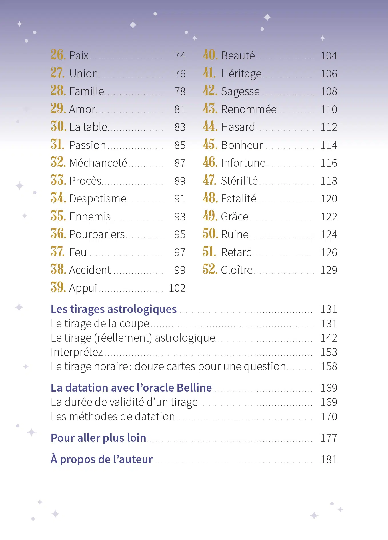 Dans le livre d’accompagnement de 184 pages tout en couleurs, vous apprendrez à identifier les familles des cartes au travers des planètes, selon une approche respectueuse de la Tradition. Vous découvrirez comment pratiquer la coupe, une méthode de tirage rapide, mais aussi les subtilités du tirage astrologique afin de répondre à toutes vos questions.