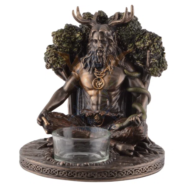 Bougeoir pour bougie chauffe-plat en résine effet bronze peinte, avec petit photophore en verre, à l'effigie du dieu celte de la nature Cernunnos, assis en tailleur contre un arbre.