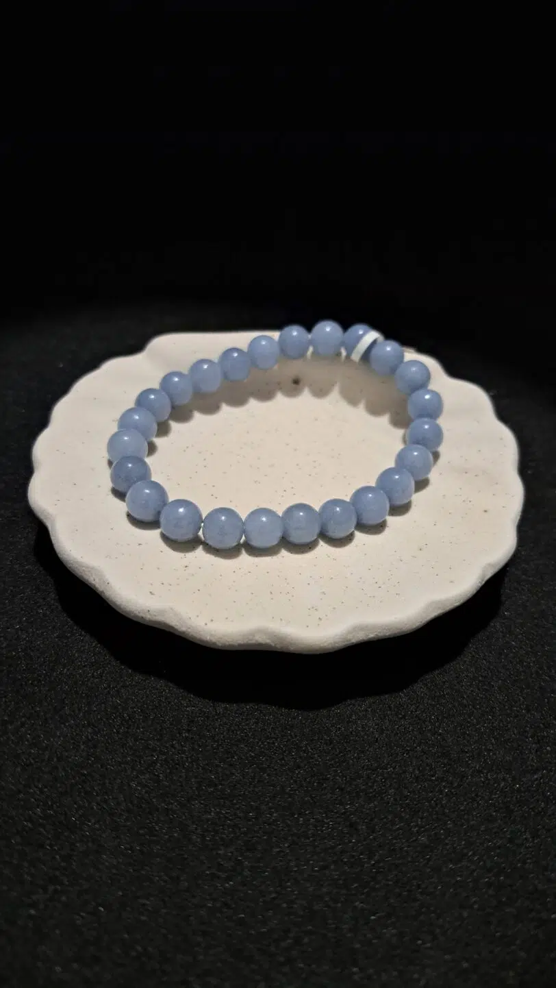 Par sa douce couleur bleu ciel, l'Angélite (aussi appelée Célestite) est associée au chakra de la gorge, qu'elle ouvre en douceur et harmonise. Mais sa principale vertu est celle de nous aider à reconnaître et à ressentir l'amour dans tout ce qui vit, apportant une profonde paix intérieure. Relie aussi naturellement à la lumière et à la douceur des plans célestes.
