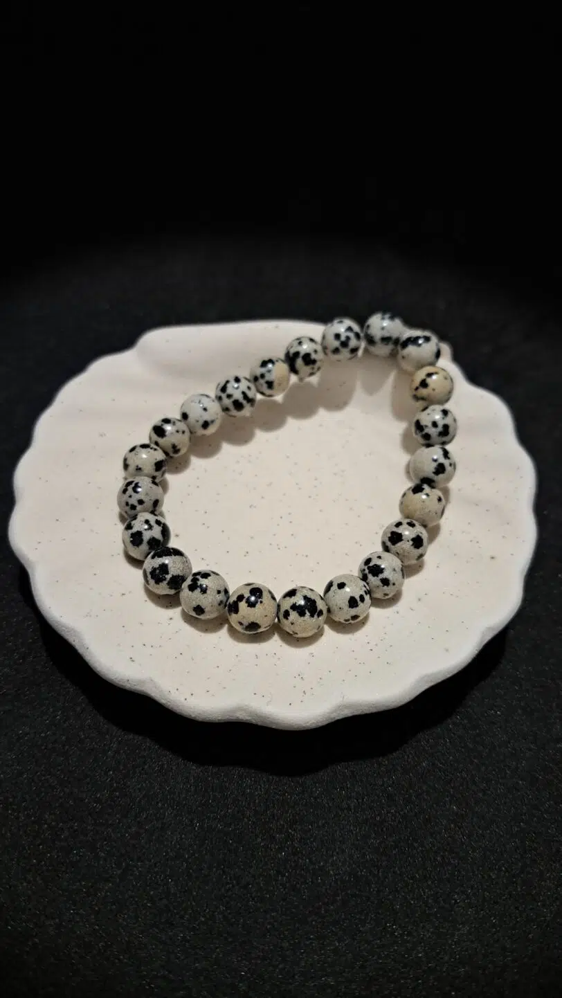 Alternance parfaite de beige et de noir, le Jaspe dalmatien possède une énergie à la fois Yin et Yang extrêmement régulatrice, et ce dans de nombreux domaines. Autant calmante que tonifiante, elle permet une circulation équilibrée des énergies dans le corps physique et les corps subtils. Ancre l'esprit dans le présent, améliorant le charisme et la confiance en soi.