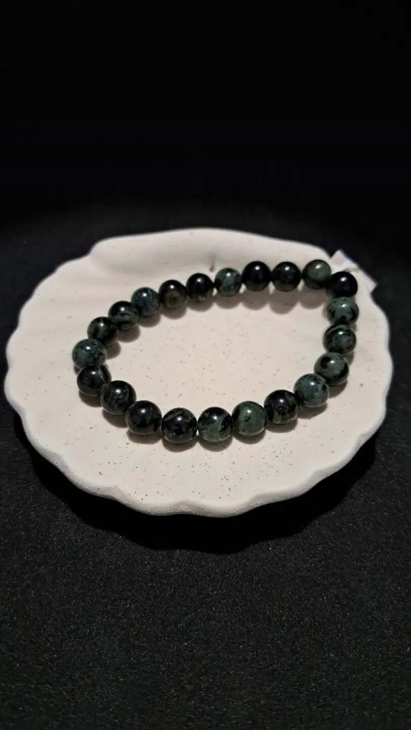 La couleur vert sombre et les motifs du Jaspe 'kambaba' imprègne notre corps des énergies de la nature. Pierre d'enracinement à la Terre, elle aide à profiter pleinement du présent sans ressasser le passé ou redouter le futur. Ce jaspe africain apaise, atténue le stress, les angoisses, l'anxiété. Il permet aussi de canaliser ses émotions, afin de mieux les gérer.