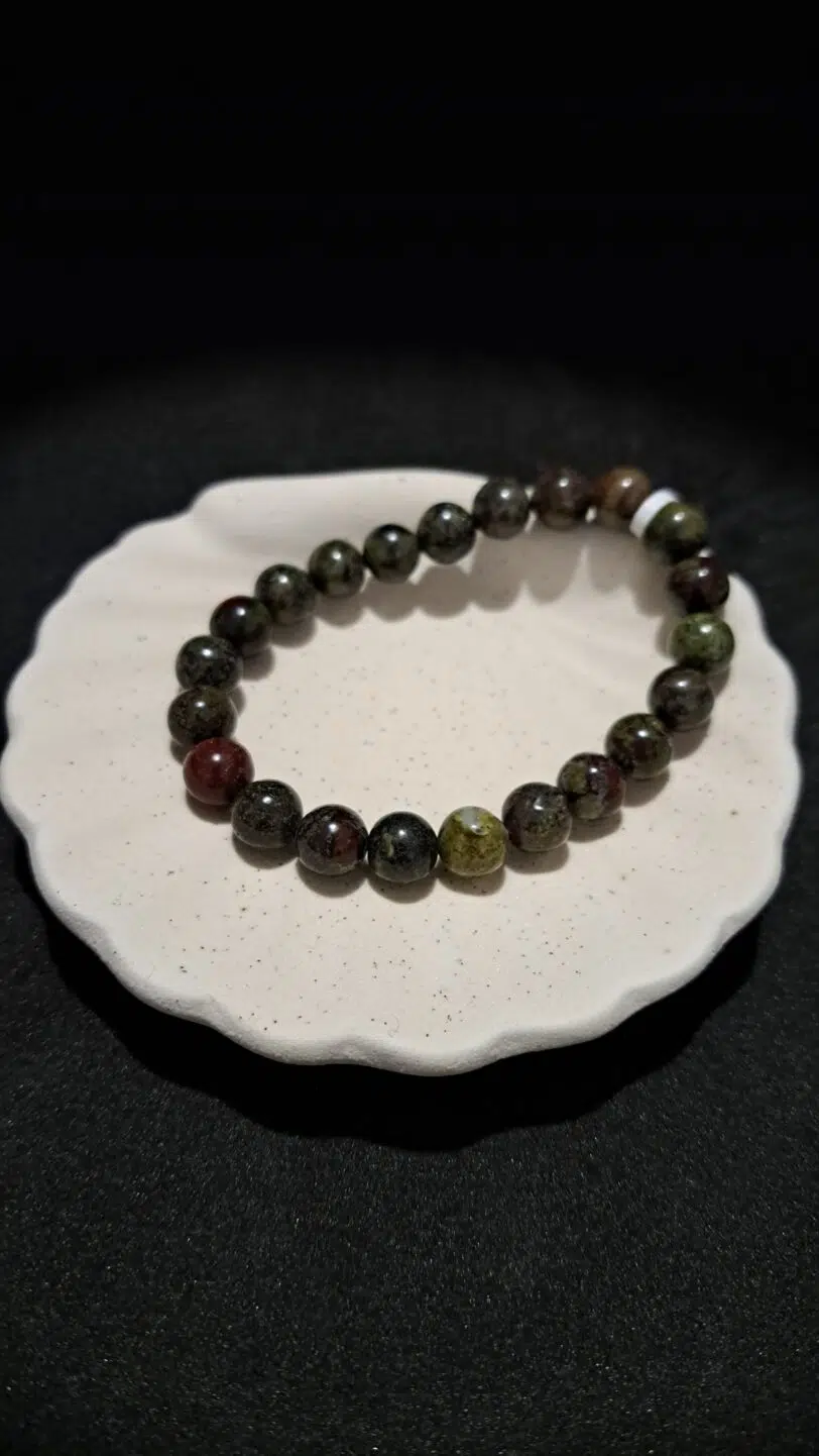 Variété de Jaspe 'héliotrope' (aussi nommé 'Dragon Stone'), le Jaspe 'sang de dragon' est une pierre mystique et magique, très énergisante. Elle bannit le mal et la négativité, dirigeant les énergies spirituelles. Elle revitalise, ancre et protège. Équilibre aussi l'irritabilité, l'agressivité et l'impatience, mais est parfois déconseillée aux personnes colériques car très énergisante.