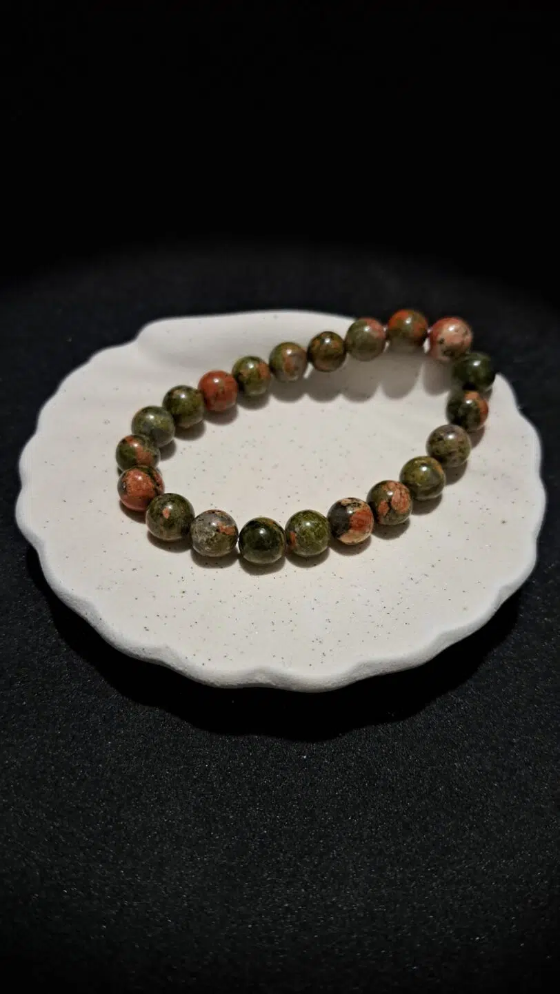 Pierre sédimentaire, l'Unakite est considérée comme une pierre de vision. Aide à visualiser le passé et l'avenir, afin d'identifier nos problèmes et les résoudre. En méditation, peut permettre de libérer des traumatismes des vies passées. Elle nous apprend à relativiser sur les situations et de prendre du recul. Réduisant le stress et renforçant la confiance et l'estime de soi.
