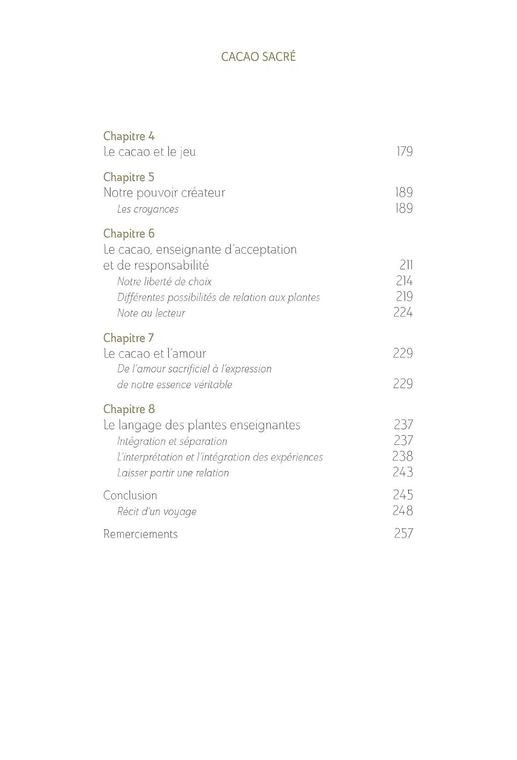 Elle transmet dans son livre, en synergie avec le cacao, une invitation à l'allégresse. Le cacao est une plante qui nous aide à nous concentrer sur le positif, pour mettre fin aux conditionnements limitants souvent liés à des aspects négatifs et pessimistes de notre vision de la vie. Ainsi, nous accédons à un état de joie qui est moins conditionné aux circonstances extérieures.