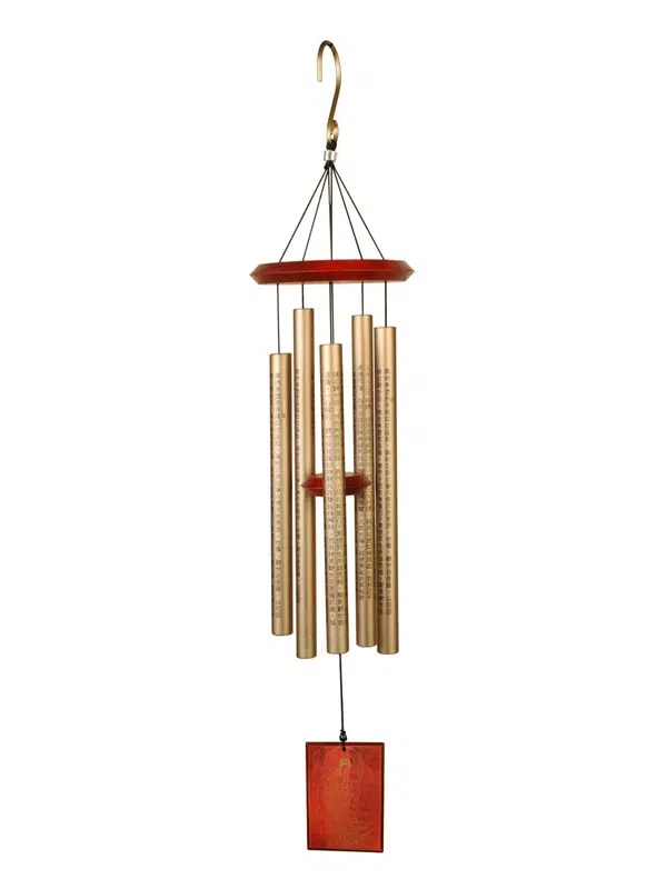 Magnifique carillon en bois rouge et tubes couleur bronze peints de prières en calligraphies chinoises, créant un accord en harmonique très doux et profond.