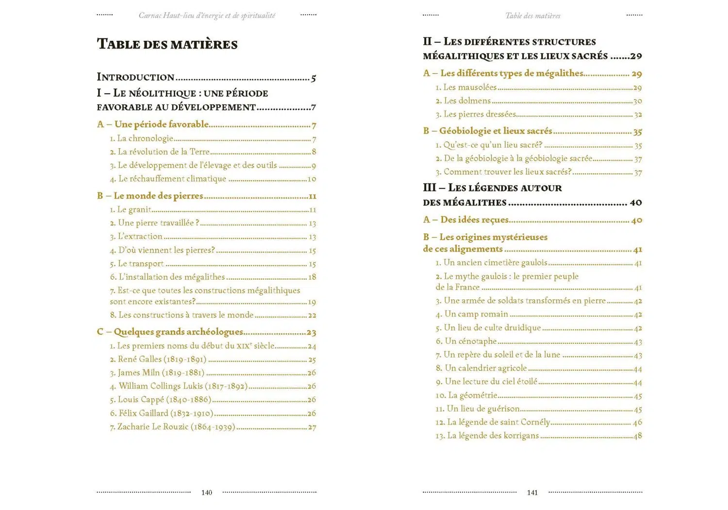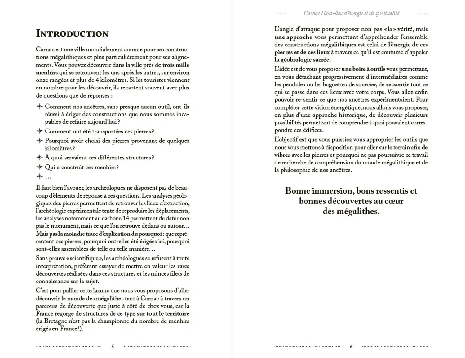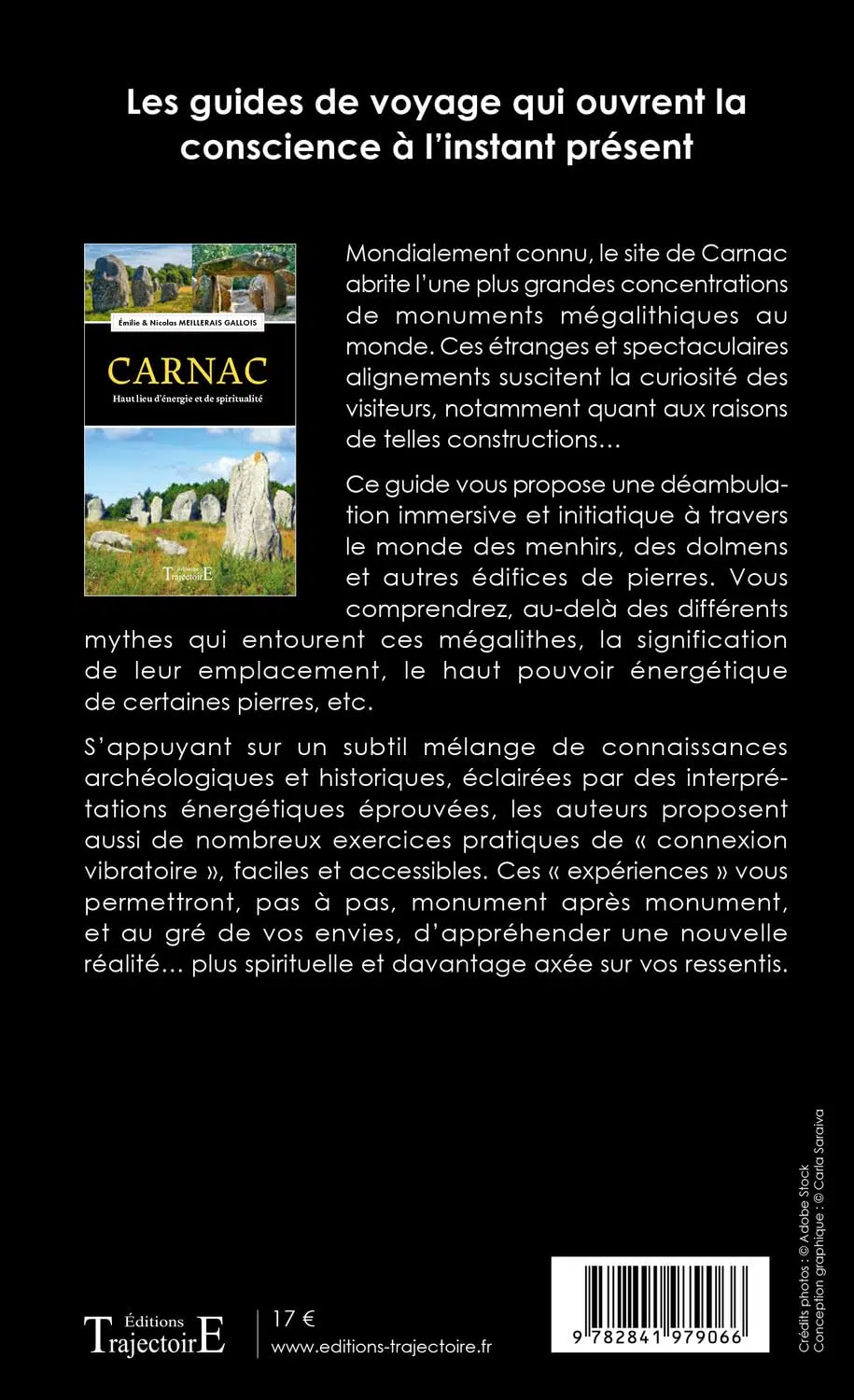 Mondialement connu, le site de Carnac abrite l’une plus grandes concentrations de monuments mégalithiques au monde. Ces étranges et spectaculaires alignements suscitent la curiosité des visiteurs, notamment quant aux raisons de telles constructions… Ce guide vous propose une déambulation immersive et initiatique à travers le monde des menhirs, des dolmens et autres édifices de pierres. Vous comprendrez, au-delà des différents mythes qui entourent ces mégalithes, la signification de leur emplacement, le haut pouvoir énergétique de certaines pierres, etc. S’appuyant sur un subtil mélange de connaissances archéologiques et historiques, éclairées par des interprétations énergétiques éprouvées, les auteurs proposent aussi de nombreux exercices pratiques de « connexion vibratoire », faciles et accessibles. Ces « expériences » vous permettront, pas à pas, monument après monument, et au gré de vos envies, d’appréhender une nouvelle réalité… plus spirituelle et davantage axée sur vos ressentis.