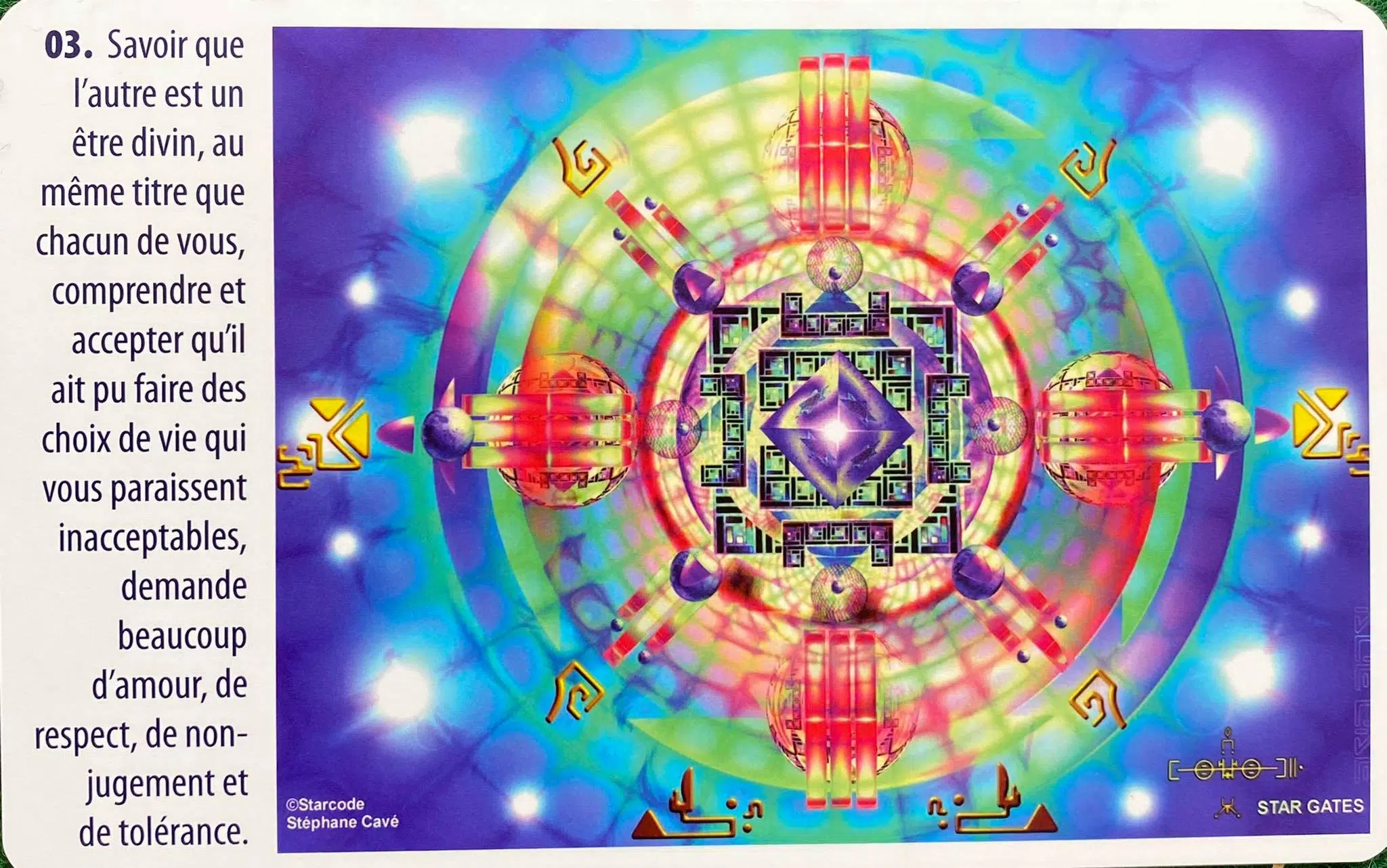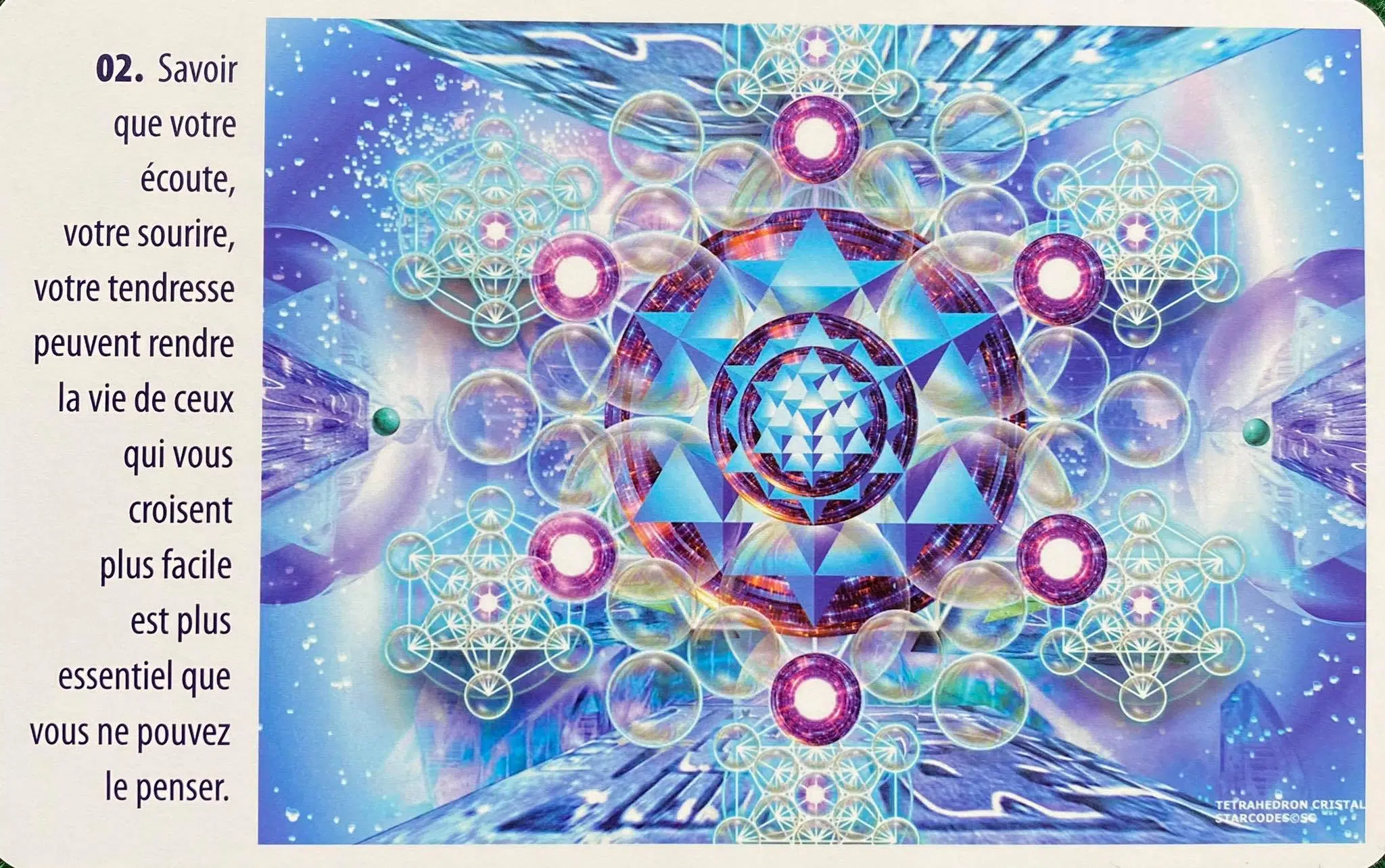 Chaque être sur cette terre a en lui une semence d'étoile. C'est ce que vous découvrirez avec ces cartes. Regardez les starcodes afin de vous réinitialiser avec ce qui en vous est connecté aux étoiles, lisez les paroles des êtres galactiques afin de réactiver ce lien entre Ciel et Terre qui a toujours été en chacun de nous… Chaque carte apporte une réponse pour vous aider à trouver votre espace et votre rôle dans le moment présent. C'est ce que nous vous souhaitons de plus beau.