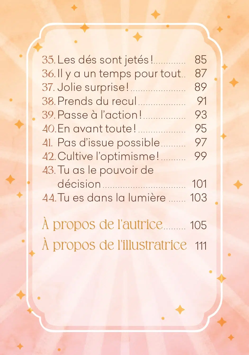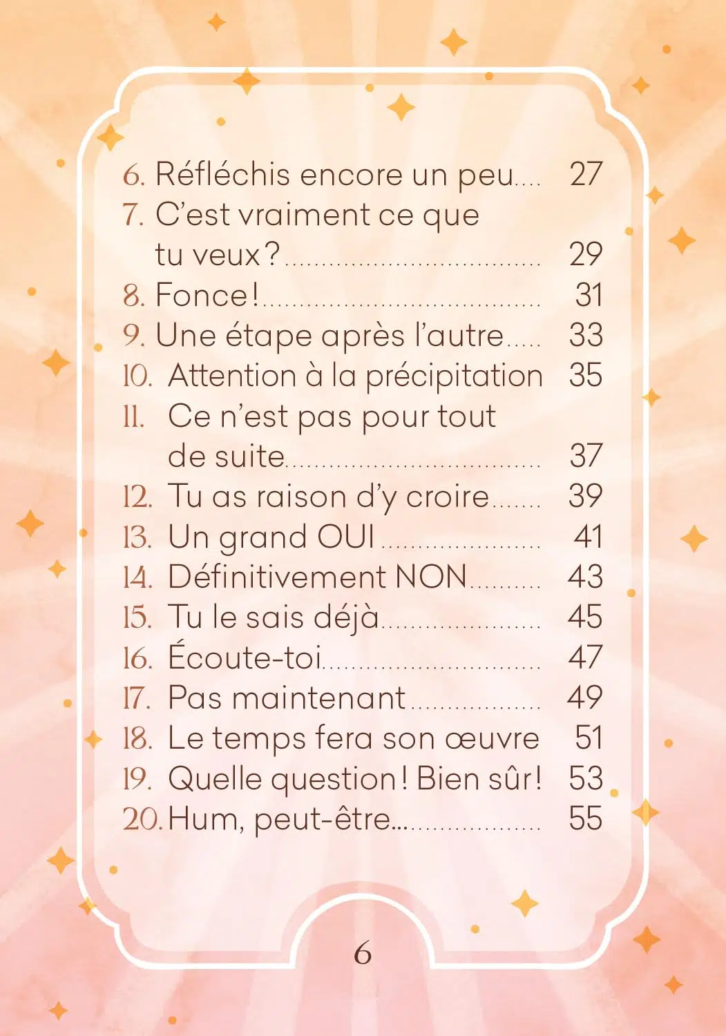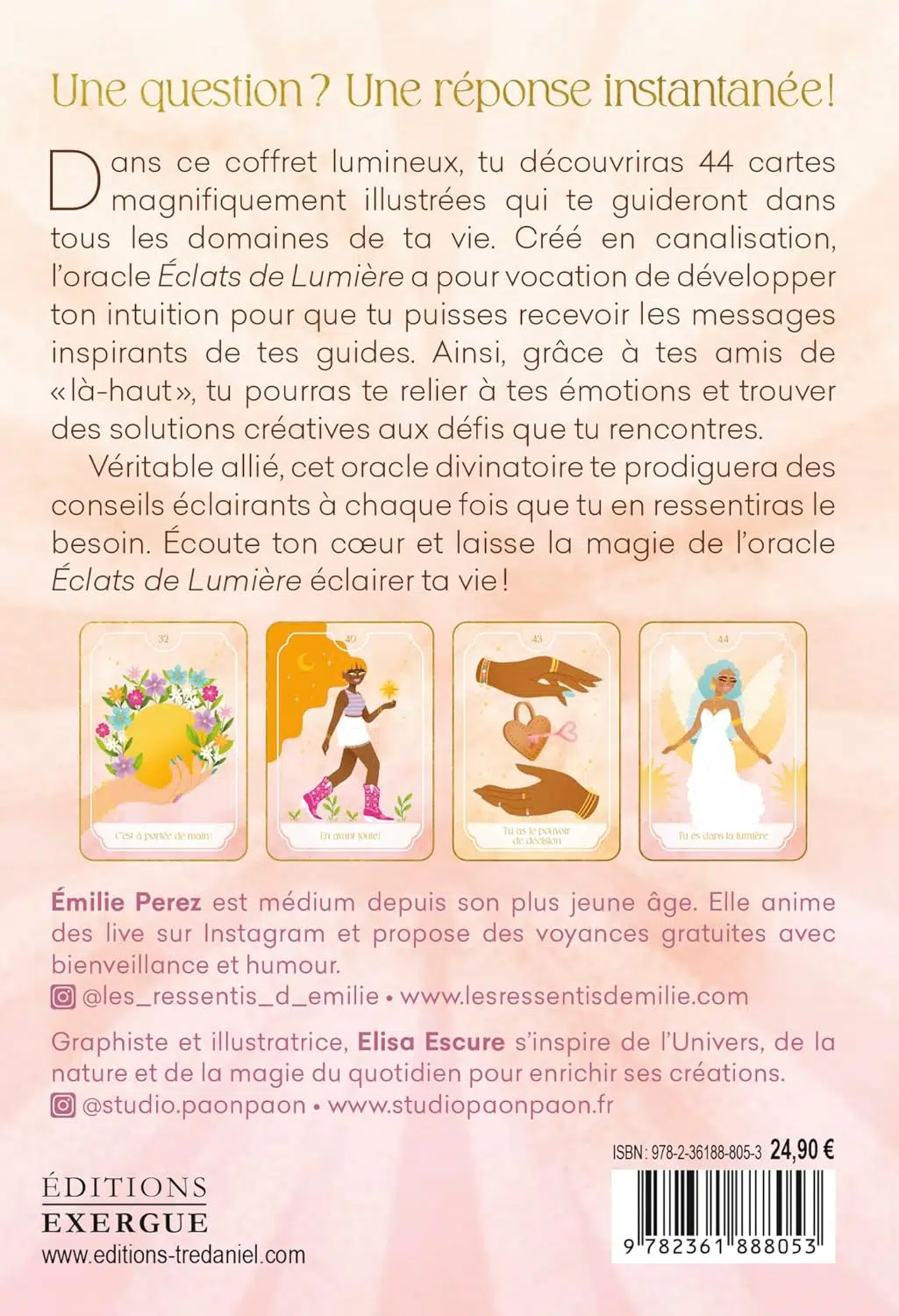 Dans ce coffret lumineux, tu découvriras 44 cartes magnifiquement illustrées qui te guideront dans tous les domaines de ta vie. Créé en canalisation, L'Oracle Lumière a pour vocation de développer ton intuition pour que tu puisses recevoir les messages inspirants de tes guides. Ainsi, grâce à tes amis de " là-haut ", tu pourras te relier à tes émotions et trouver des solutions créatives aux défis que tu rencontres.