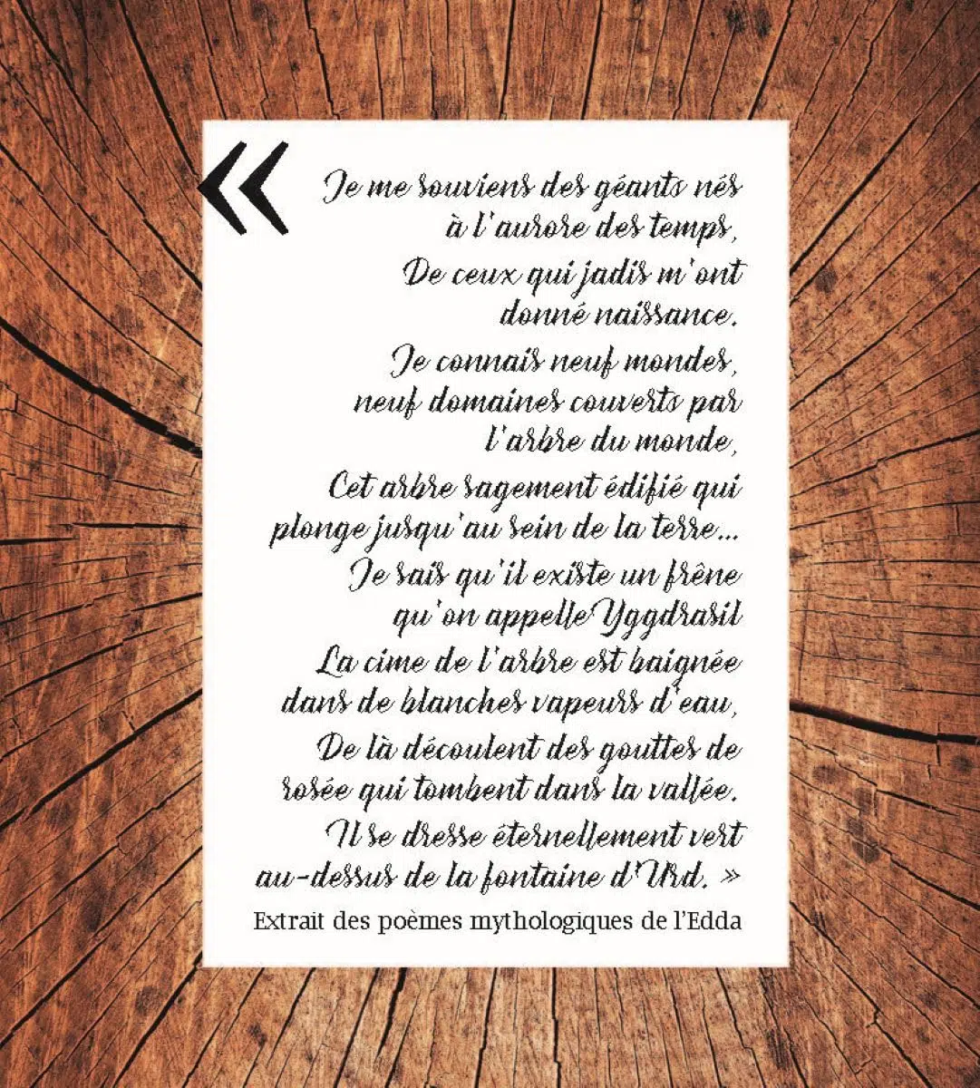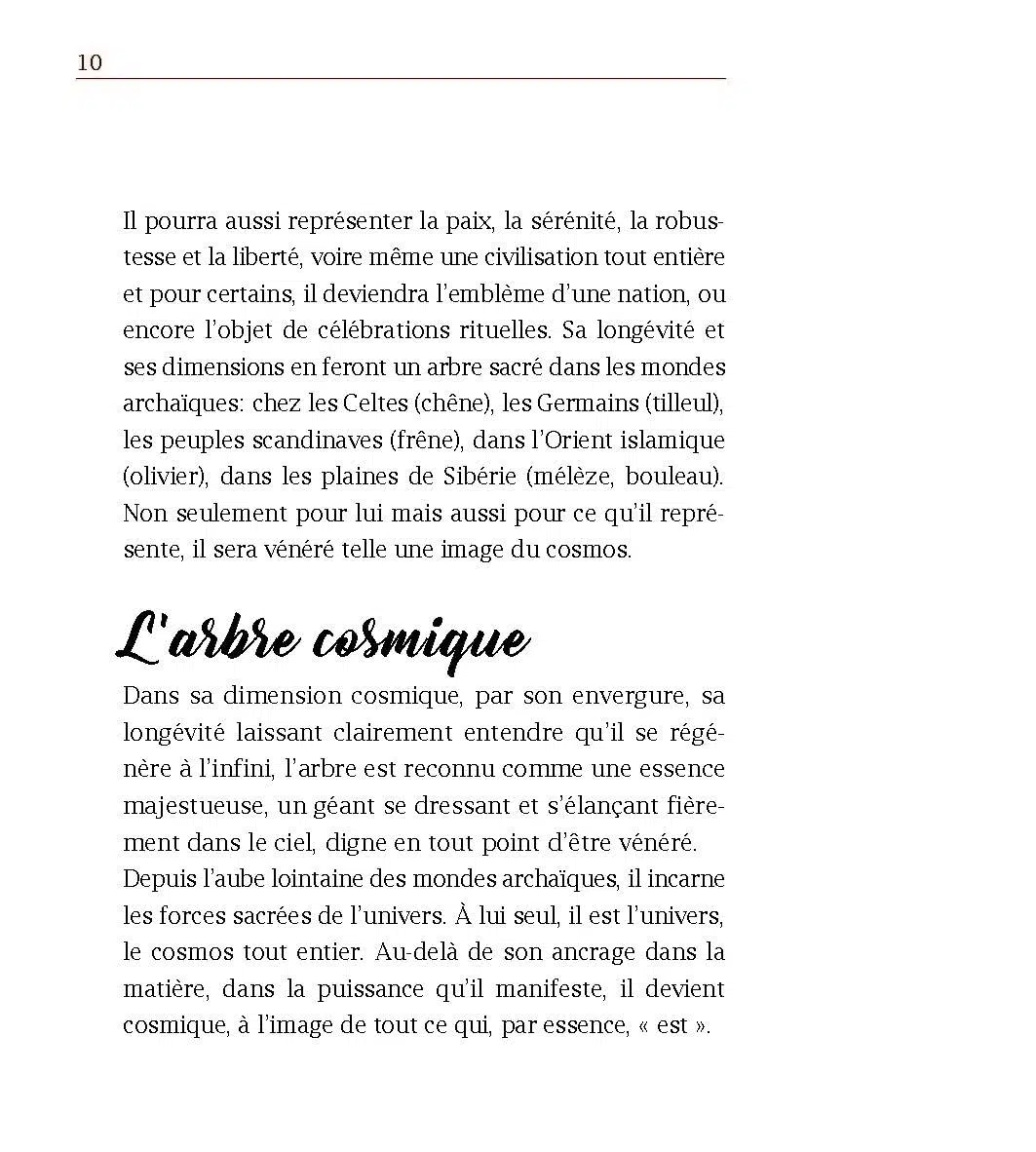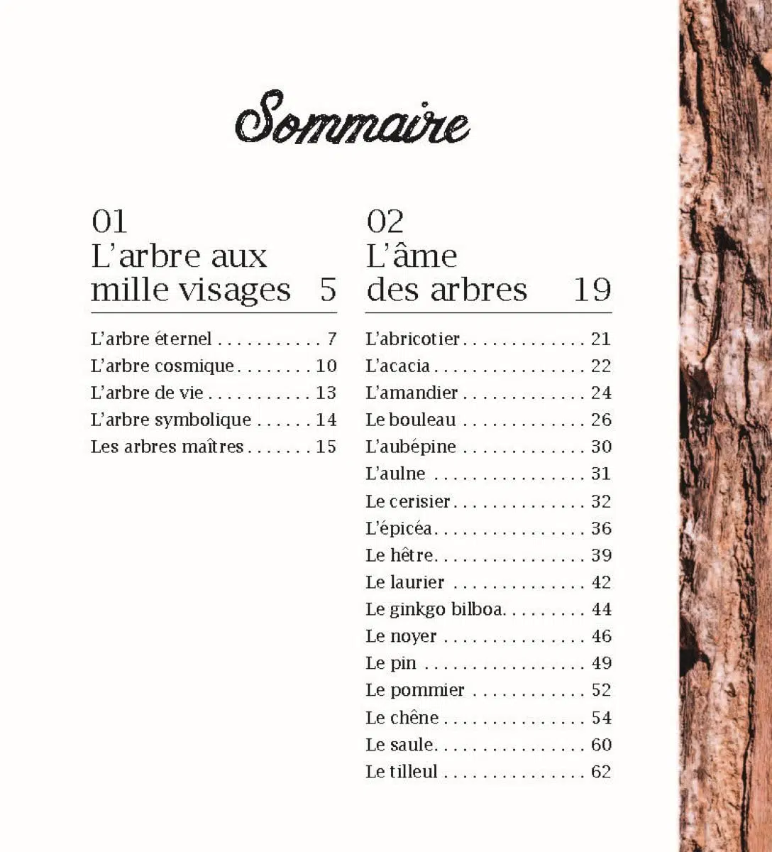Vous y découvrirez une introductive sur les arbres, leur force, les esprits (l’arbre de vie, l’arbre cosmique, les arbres maîtres) puis une seconde partie centrée sur plusieurs espèces (acacia, bouleau, aubépine, sapin, gingko biloba, saule, noyer, pin, pommier, etc.). Sur chacune de ces fiches, l’auteur relate les symboliques associées à chacun, la façon dont les hommes les ont utilisés, la mythologie dans laquelle ils sont ancrés.