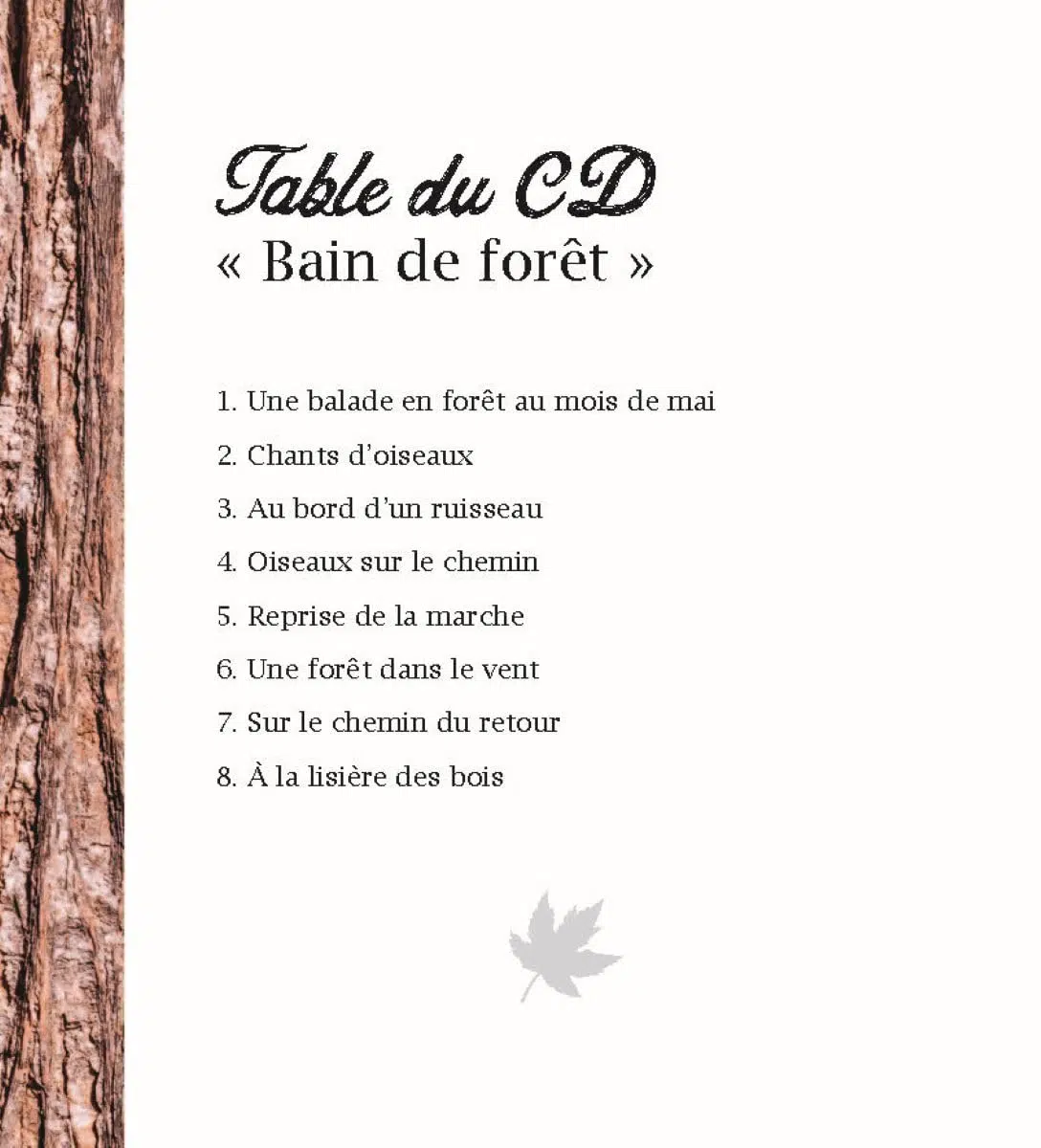 Bruits de sous-bois, vent dans les branches, pas dans les feuilles mortes, cours d'eau, chants oiseaux... Les musiques accompagnant ce livre vous offriront un vrai moment de détente et d'évasion dans la forêt !