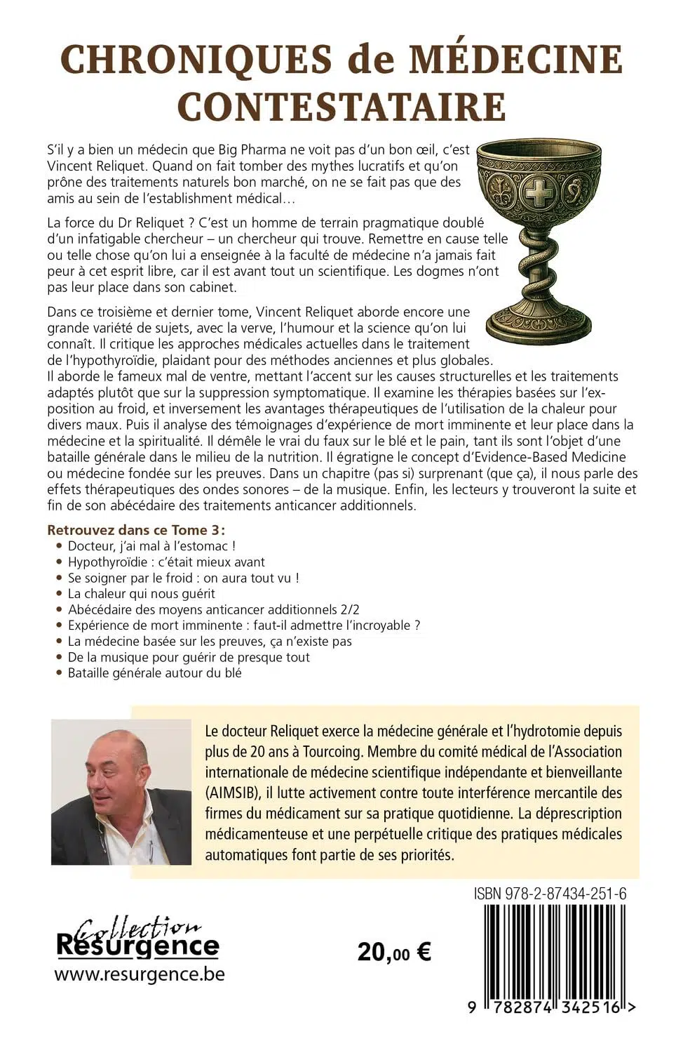 Dans ce troisième et dernier tome, Vincent Reliquet aborde encore une grande variété de sujets, avec la verve, l’humour et la science qu’on lui connaît. Il critique les approches médicales actuelles dans le traitement de l’hypothyroïdie, plaidant pour des méthodes anciennes et plus globales. Il aborde le fameux mal de ventre, mettant l’accent sur les causes structurelles et les traitements adaptés plutôt que sur la suppression symptomatique. Il examine les thérapies basées sur l’exposition au froid, et inversement les avantages thérapeutiques de l’utilisation de la chaleur pour divers maux. Puis il analyse des témoignages d’expérience de mort imminente et leur place dans la médecine et la spiritualité. Il démêle le vrai du faux sur le blé et le pain, tant ils sont l’objet d’une bataille générale dans le milieu de la nutrition. Il égratigne le concept d’Evidence-Based Medicine ou médecine fondée sur les preuves. Dans un chapitre (pas si) surprenant (que ça), il nous parle des effets thérapeutiques des ondes sonores – de la musique. Enfin, les lecteurs y trouveront la suite et fin de son abécédaire des traitements anticancer additionnels.