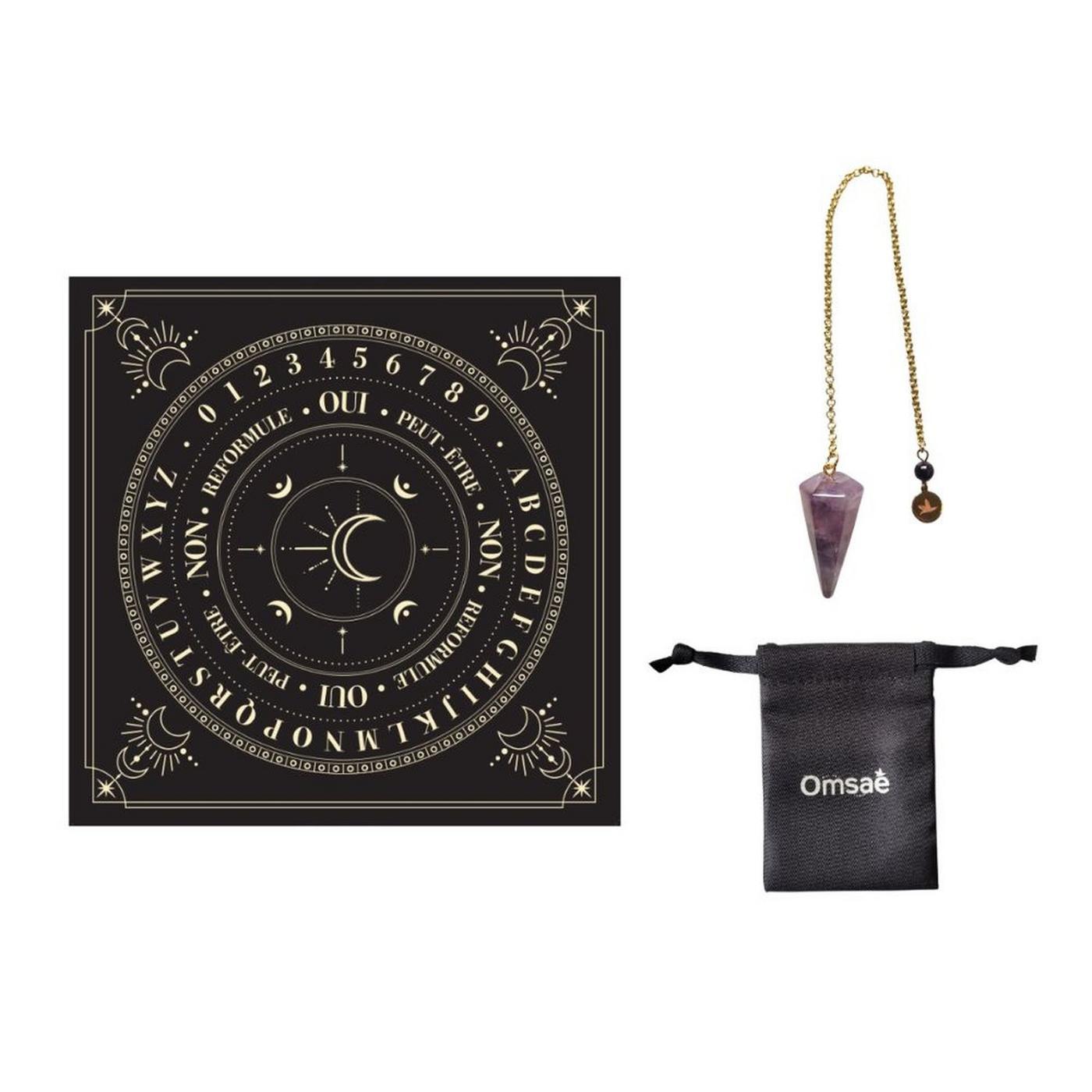La radiesthésie ou sensibilité aux rayonnements, est une technique basée sur le ressenti des radiations qui émanent de notre corps ou de la Terre pour nous permettre de faire émerger des réponses cachées. Ce coffret se compose d'accessoires indispensables pour les séances de divination. Un pendule hexagonal en améthyste : prolongement de l'âme, le pendule amplifie les ondes vibratoires émises par le corps et permet de révéler les réponses cachées dans notre subconscient. Grâce aux vibrations violettes apaisantes de sa pierre naturelle d'améthyste, le pendule viendra renforcer l'intuition. Une nappe de divination : avant de débuter la séance, créer son autel dans un espace calme et apaisant et installer la nappe en son centre. Chaque lettre et chaque chiffre y est représenté pour permettre au pendule d'indiquer une réponse précise. Quelle que soit la question, ouverte ou fermée, le pendule pourra y répondre…. Un pochon de transport : glisser le pendule à l’intérieur pour l’emporter facilement avec soi.