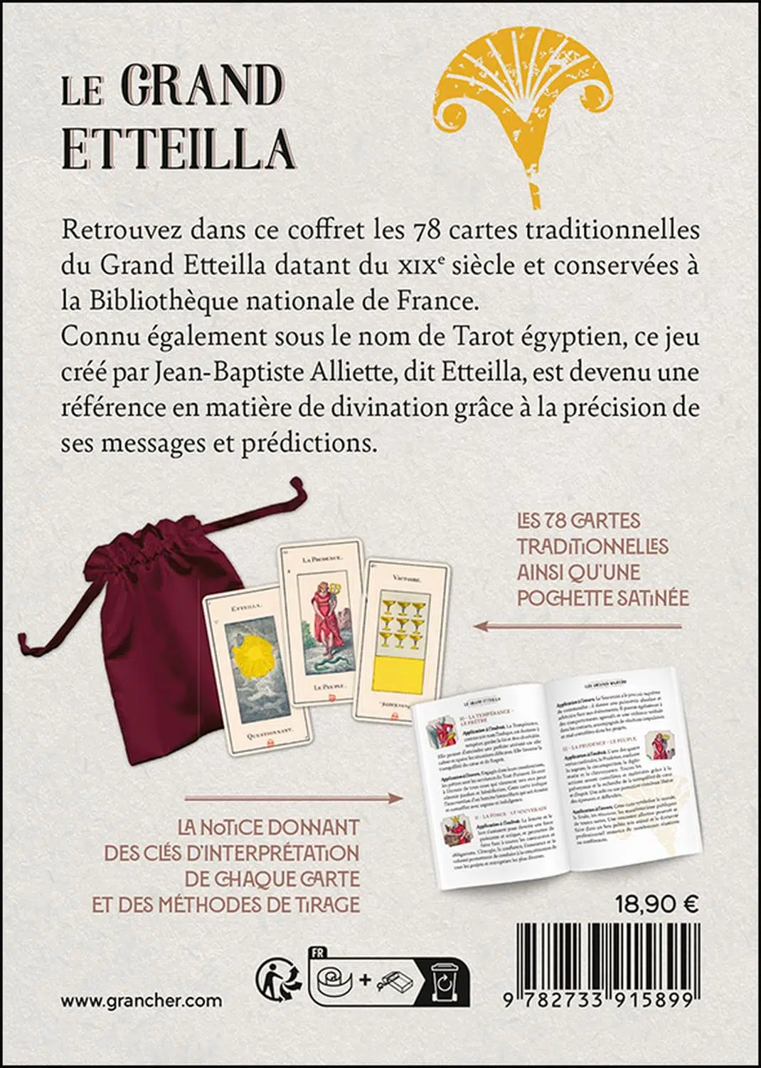 Retrouvez dans ce coffret les 78 cartes traditionnelles du Grand Etteilla datant du XIXe siècle et conservées à la Bibliothèque nationale de France. Connu également sous le nom de "Tarot égyptien" (bien que ce ne oit pas son origine réelle), ce jeu créé par Etteilla, est devenu une référence en matière de divination grâce à la précision de ses messages et prédictions. La notice donne des clés d’interprétation de chaque carte et des méthodes de tirage.