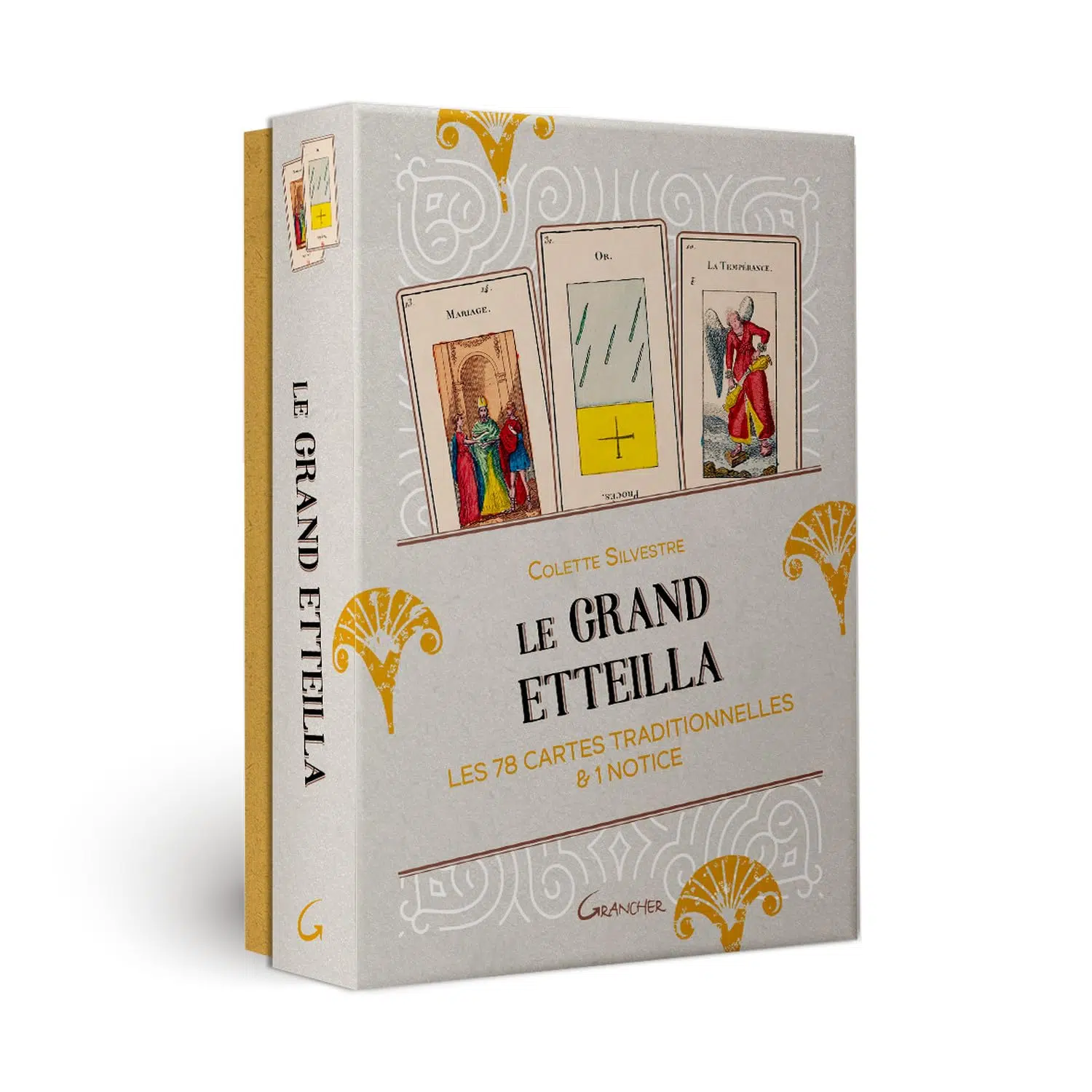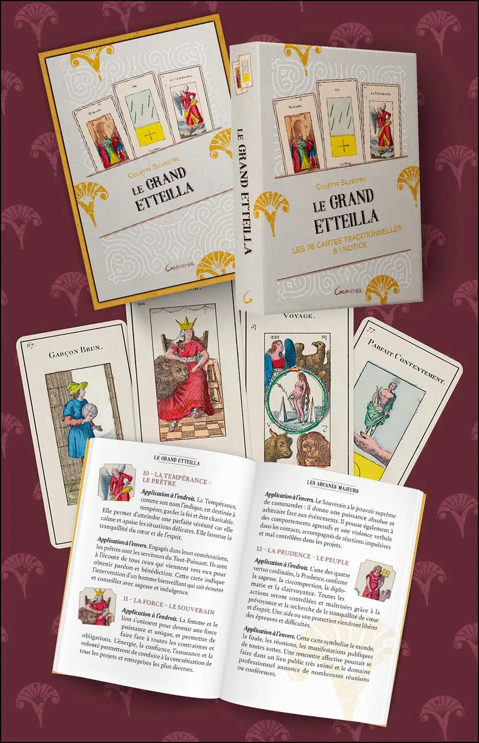 Le Grand Etteilla est le premier tarot annoté de mots clés, conçu par Jean-Baptiste Alliette (dit Etteilla) au XIXème siècle. Si ses 22 arcanes mineurs restent sujet à polémique, ses 56 mineurs devinrent la base fondamentale de la majorité qui lui succédèrent, comme celui de Papus, ou encore le célèbre Rider Waite et toutes ses déclinaisons plus moderne.