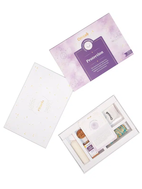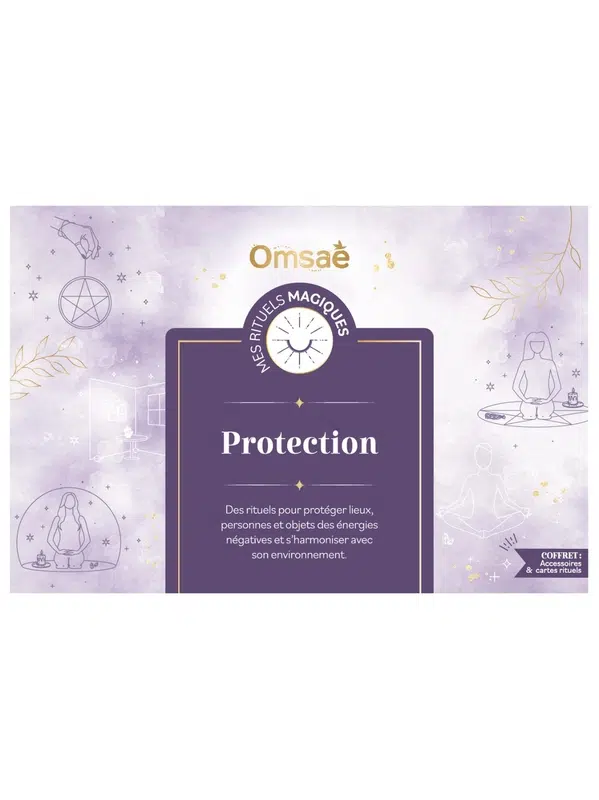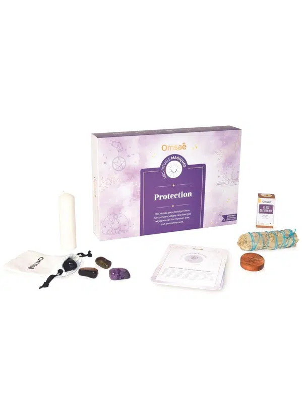Découvrez le coffret Omsaé Rituels de Protection pour protéger lieux, personnes et objets des énergies négatives et s'harmoniser avec son environnement. Ce coffret est composé d'un bâton de sauge blanche, d'une bougie blanche, de sel de l'Himalaya, d'une amulette de protection, de 4 pierres roulées naturelles (obsidienne noire, œil de tigre, labradorite et améthyste) et de 6 cartes rituels. Tout ce qui nous entoure est constitué d'énergie, parfois positive, parfois négative et nous impacte sans même que l'on s'en rende compte. Pour se protéger de ces énergies négatives ou pour s'en défaire, des rituels de protection peuvent être mis en place pour aider à se sentir plus fort et plus serein. Omsaé a développé ce coffret complet pour se protéger des énergies négatives. Les accessoires qui le composent et les cartes qui sont glissées à l'intérieur permettent de réaliser les rituels, d'accompagner dans la pratique et de profiter des belles énergies lunaires.