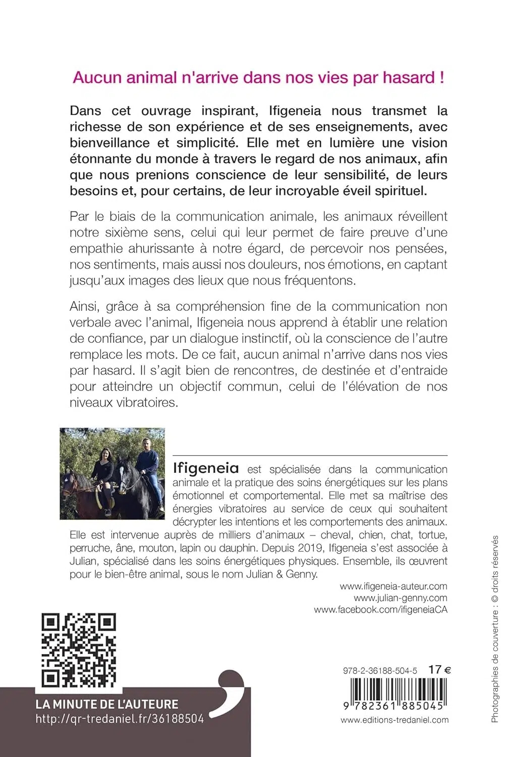 Ainsi, grâce à sa compréhension fine de la communication non verbale avec l'animal, Ifigeneia nous apprend à établir une relation de confiance, au sein d'un dialogue instinctif, où la conscience de l'autre remplace les mots. De ce fait, aucun animal n'arrive dans une vie humaine par hasard. Il s'agit bien de rencontre, de destinée, et d'entraide, pour accomplir un but commun, celui de l'élévation de nos niveaux vibratoires.