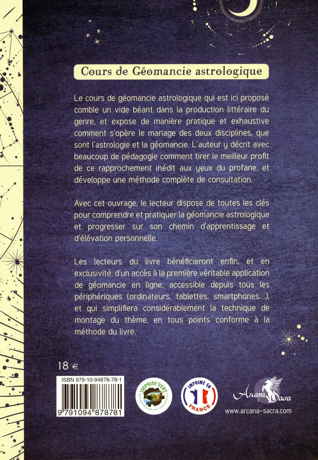 Le cours de Géomancie astrologique qui est ici proposé comble un vide béant dans la production littéraire du genre, et expose de manière pratique et exhaustive comment s'opère le mariage des deux disciplines, que sont l'Astrologie et la Géomancie. L'auteur y décrit avec beaucoup de pédagogie comment tirer le meilleur profit de ce rapprochement inédit aux yeux du profane, et développe une méthode complète de consultation.