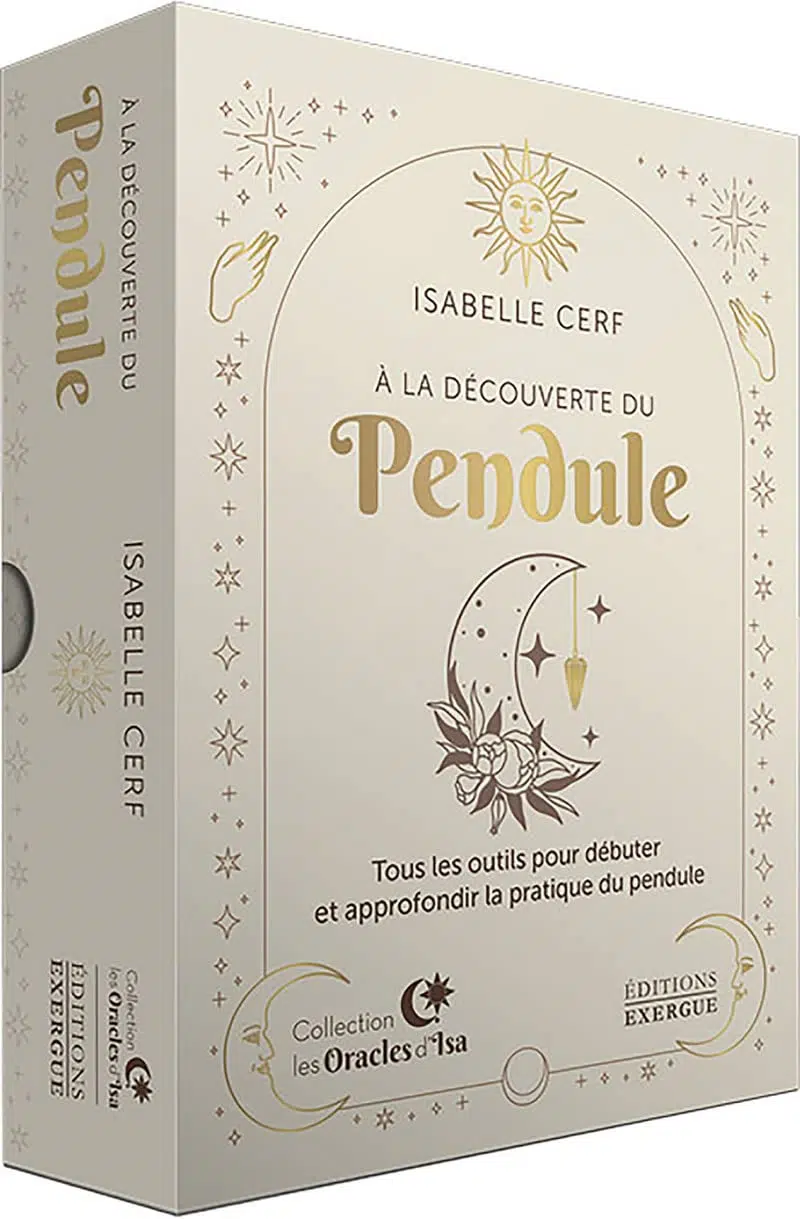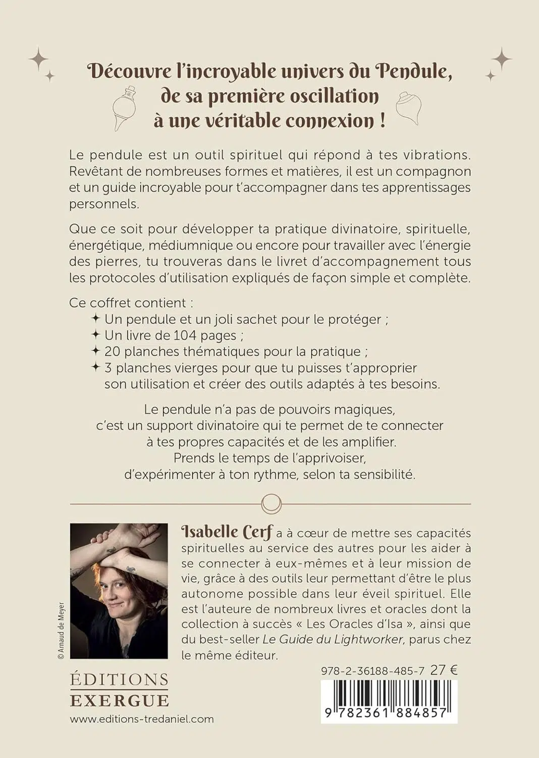 Isabelle Cerf te propose ainsi dans ce coffret tout le nécessaire pour t'accompagner dans la découverte et la pratique du pendule.
