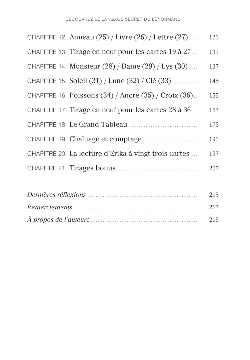 Plutôt que de présenter un simple catalogue des significations des cartes l'une après l'autre, l'auteure les associe entre elles et vous propose plusieurs façons de réaliser vos tirages – du plus facile à trois cartes au fameux Grand Tableau Lenormand –, tout en vous encourageant à cultiver une connexion personnelle avec vos cartes pour éveiller votre intuition.