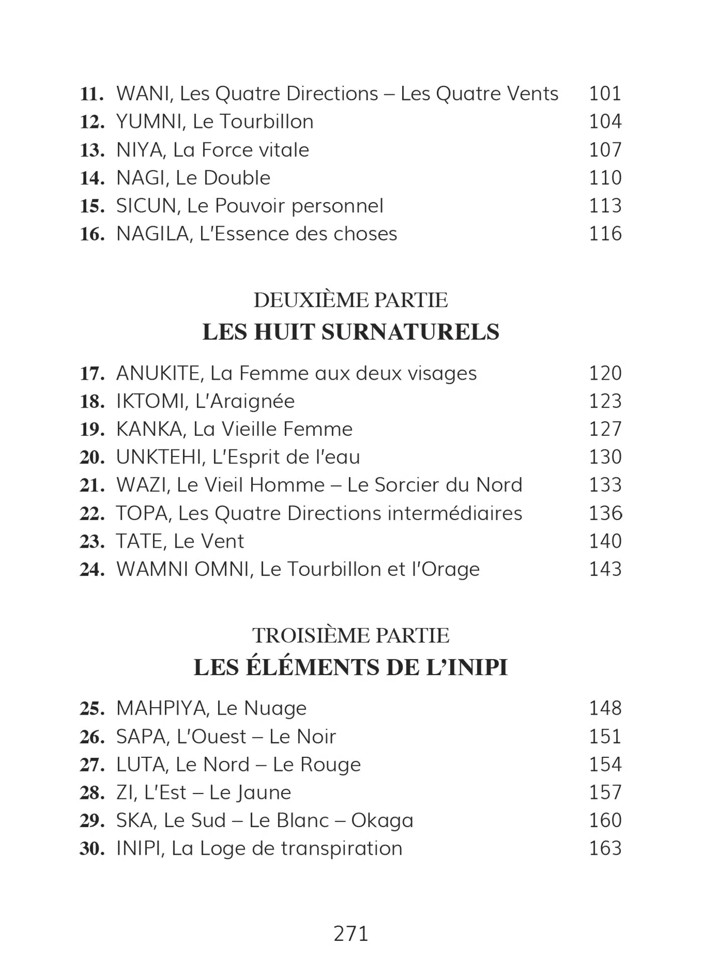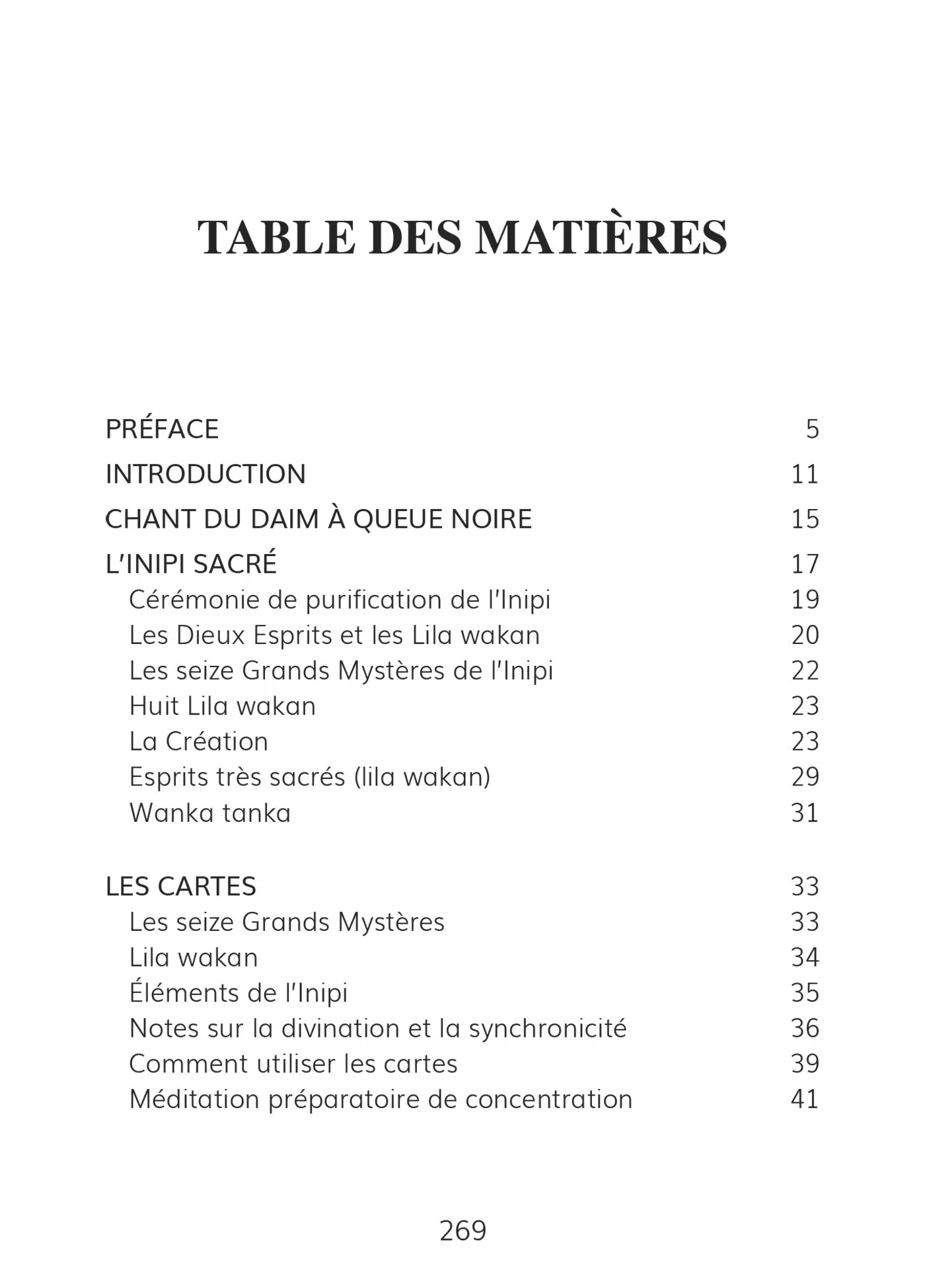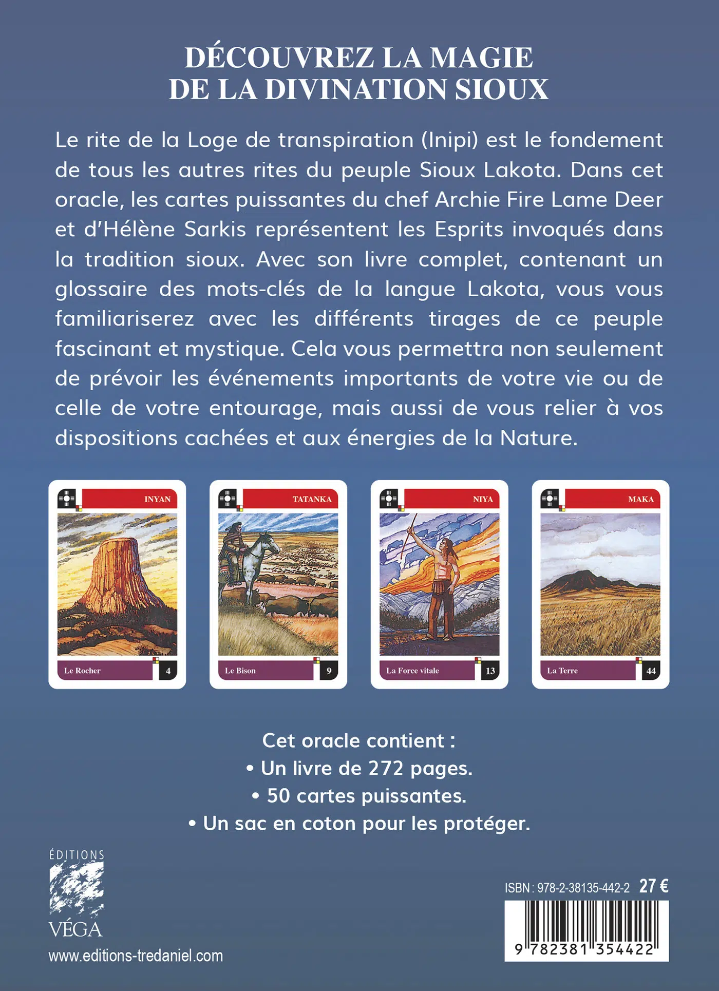 Le rite de la Loge de transpiration (Inipi) est le fondement de tous les autres rites du peuple Sioux Lakota. Dans cet oracle, les cartes puissantes du chef Archie Fire Lame Deer et d'Hélène Sarkis représentent les Esprits invoqués dans la tradition sioux.
