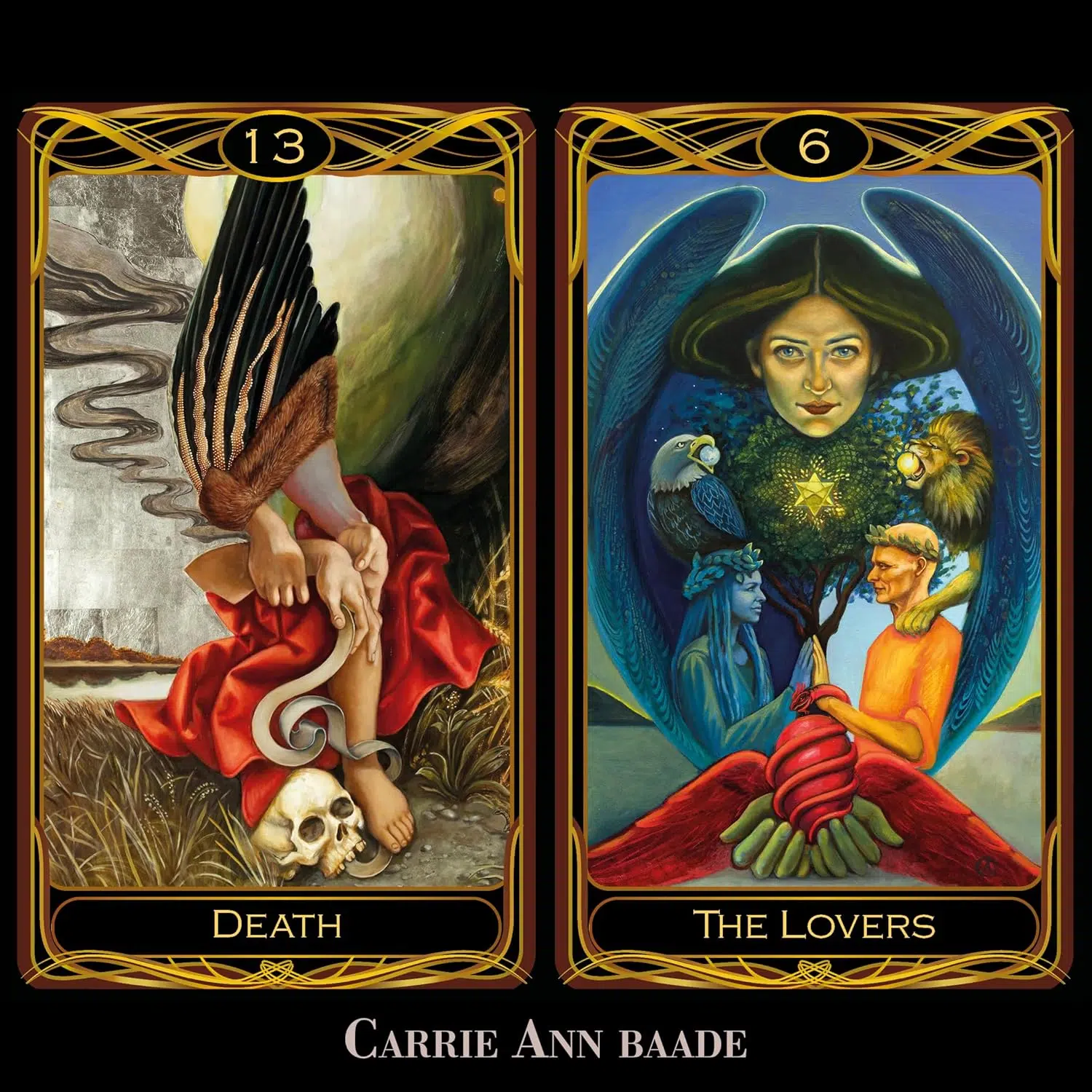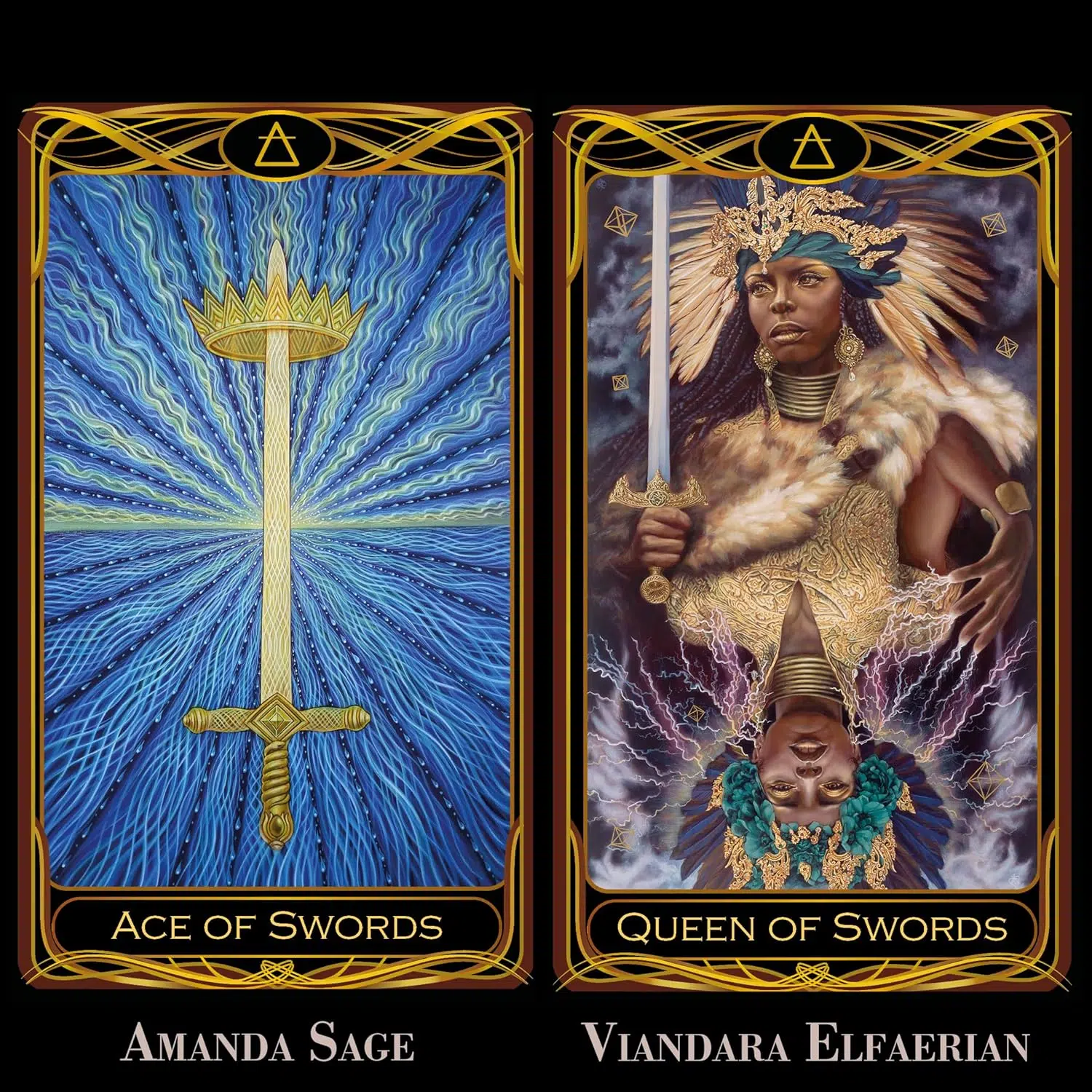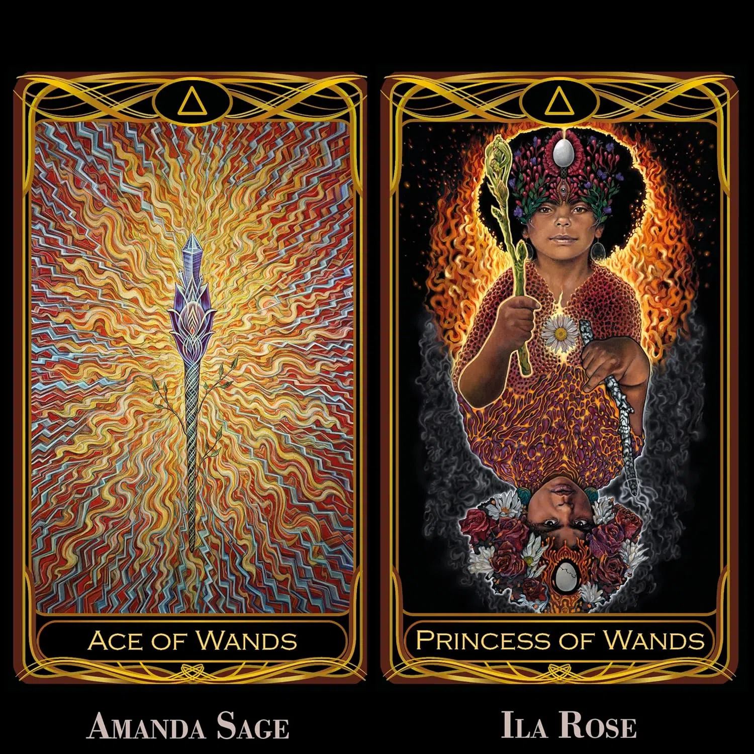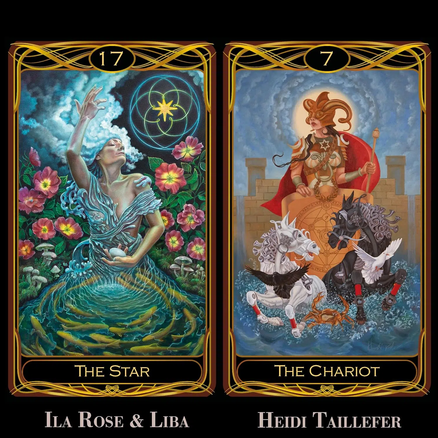 Le jeu de tarot Rêves et Divinités et son guide sont une création époustouflante, méticuleusement peinte à la main par sept artistes femmes sur une période de sept ans. Amanda Sage, Carrie Ann Baade, Heidi Taillefer, Ila Rose, Liba Waring Stambollion, Martina Hoffmann, Viandara Elfaerian.