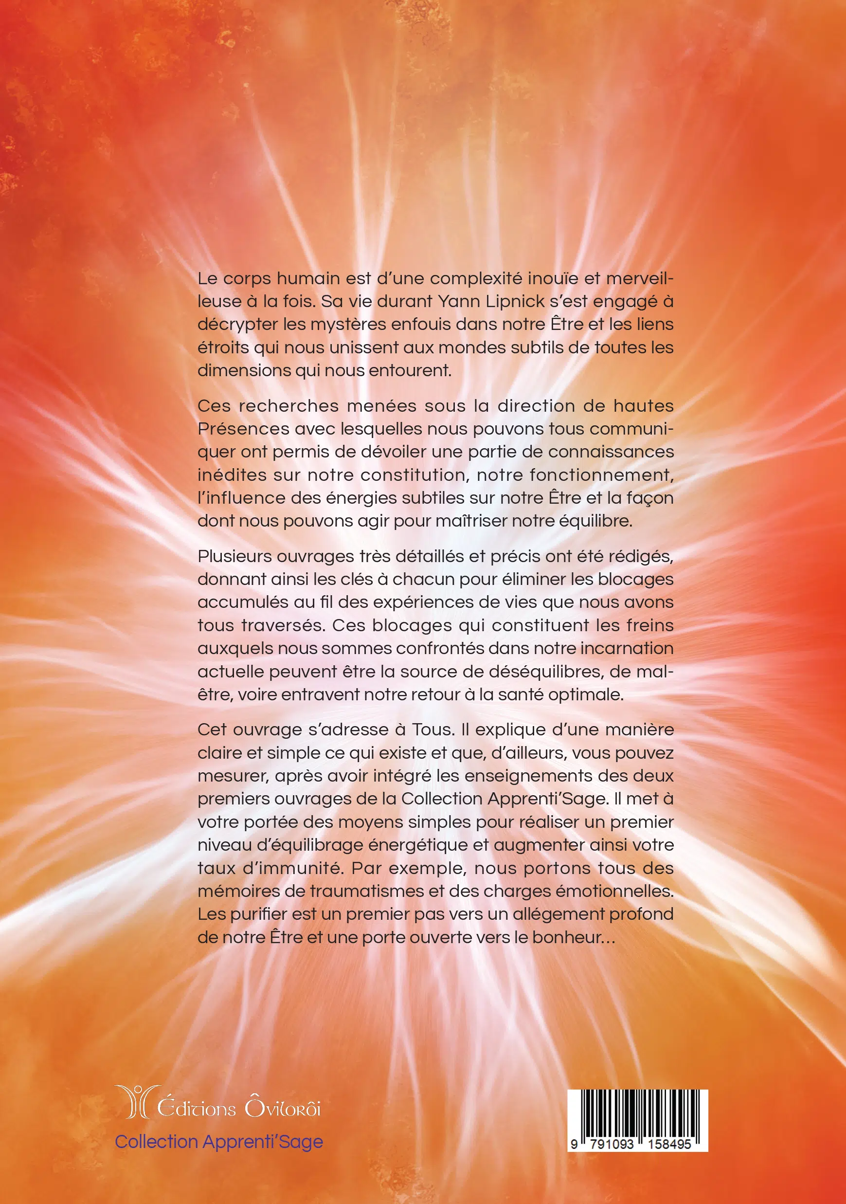 Cet ouvrage s’adresse à Tous. Il explique d’une manière claire et simple ce qui existe et que, d’ailleurs, vous pouvez mesurer, après avoir intégré les enseignements des deux premiers ouvrages de la Collection Apprenti’Sage. Il met à votre portée des moyens simples pour réaliser un premier niveau d’équilibrage énergétique et augmenter ainsi votre taux d’immunité. Par exemple, nous portons tous des mémoires de traumatismes et des charges émotionnelles. Les purifier est un premier pas vers un allégement profond de notre Être et une porte ouverte vers le bonheur…