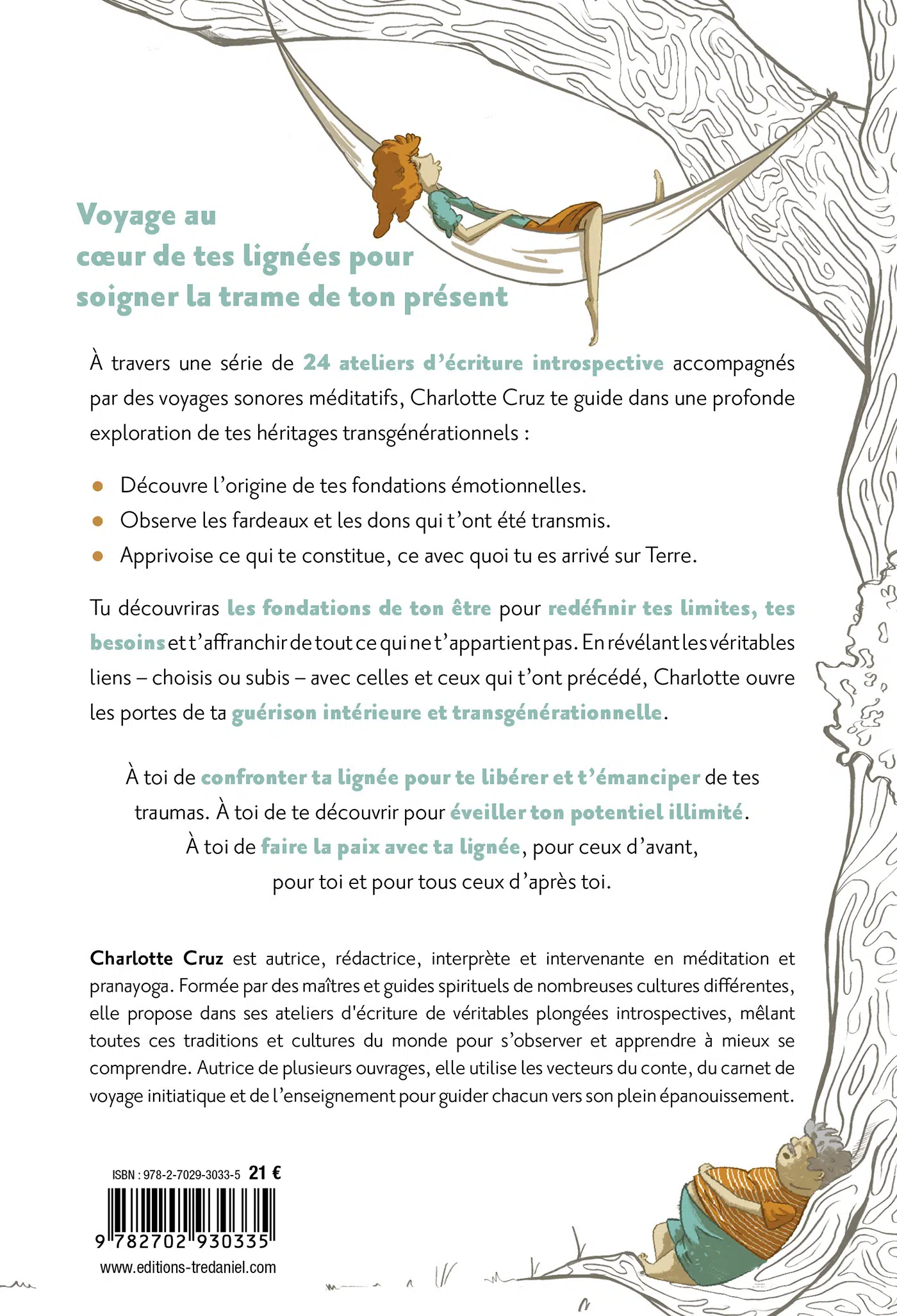 À travers une série de 24 ateliers d’écriture introspective accompagnés par des voyages sonores méditatifs, Charlotte Cruz vous guide dans une profonde exploration de vos héritages transgénérationnels :