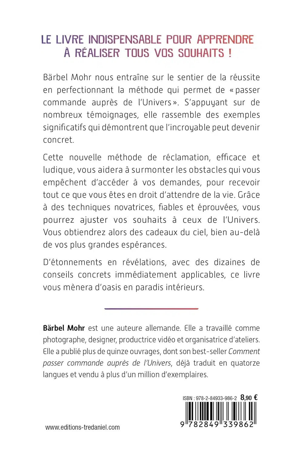 Devant l'immense succès de son livre précédent, Bärbel Mohr nous entraîne sur le sentier de la réussite en perfectionnant la méthode qui permet de "passer commande auprès de l'Univers. S'appuyant sur de nombreux témoignages reçus, elle nous relate les exemples les plus significatifs qui démontrent, clairement, que l'incroyable peut devenir concret et vous accorder tout ce que vous êtes en droit d'attendre de la vie.