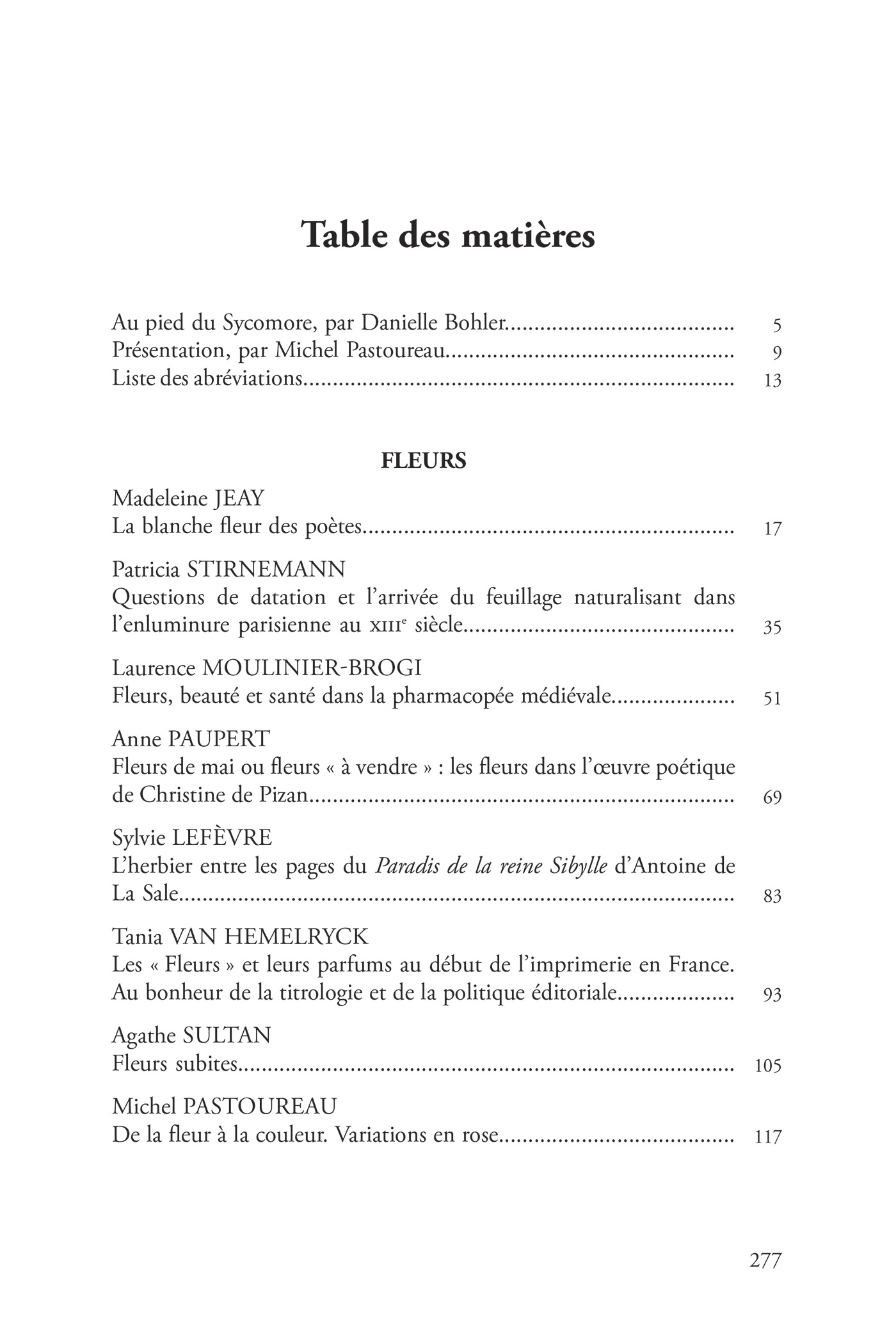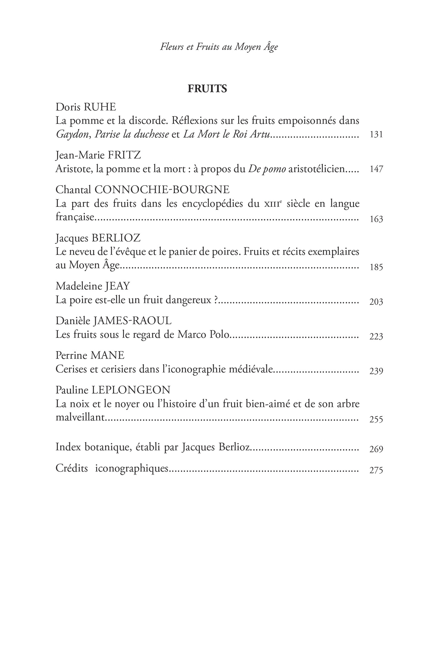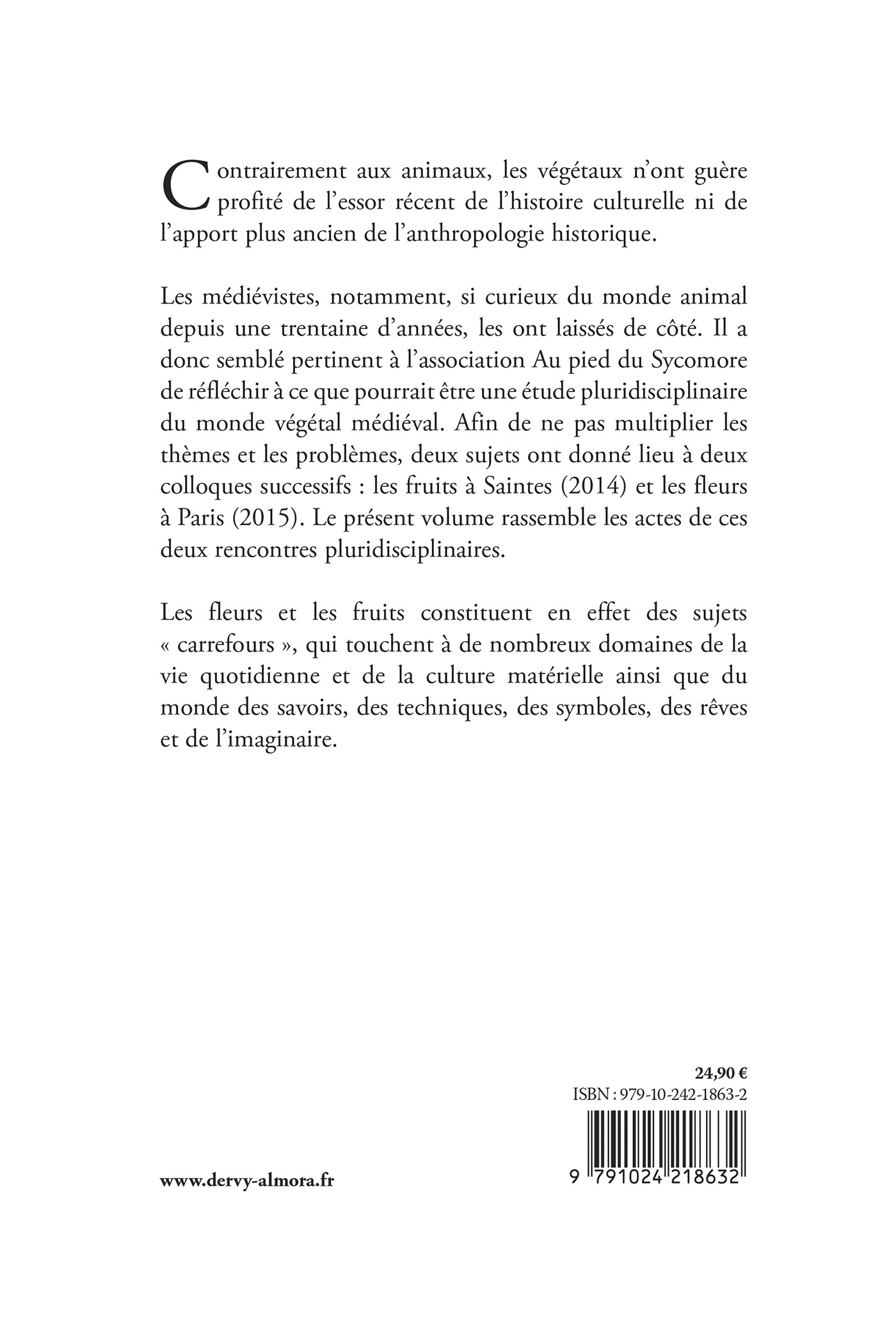 Les médiévistes, notamment, si curieux du monde animal depuis une trentaine d’années, les ont laissés de côté. Il a donc semblé pertinent à l’association Au pied du Sycomore de réfléchir à ce que pourrait être une étude pluridisciplinaire du monde végétal médiéval. Afin de ne pas multiplier les thèmes et les problèmes, deux sujets ont donné lieu à deux colloques successifs : les fruits à Saintes (2014) et les fleurs à Paris (2015). Le présent volume rassemble les actes de ces deux rencontres pluridisciplinaires.
