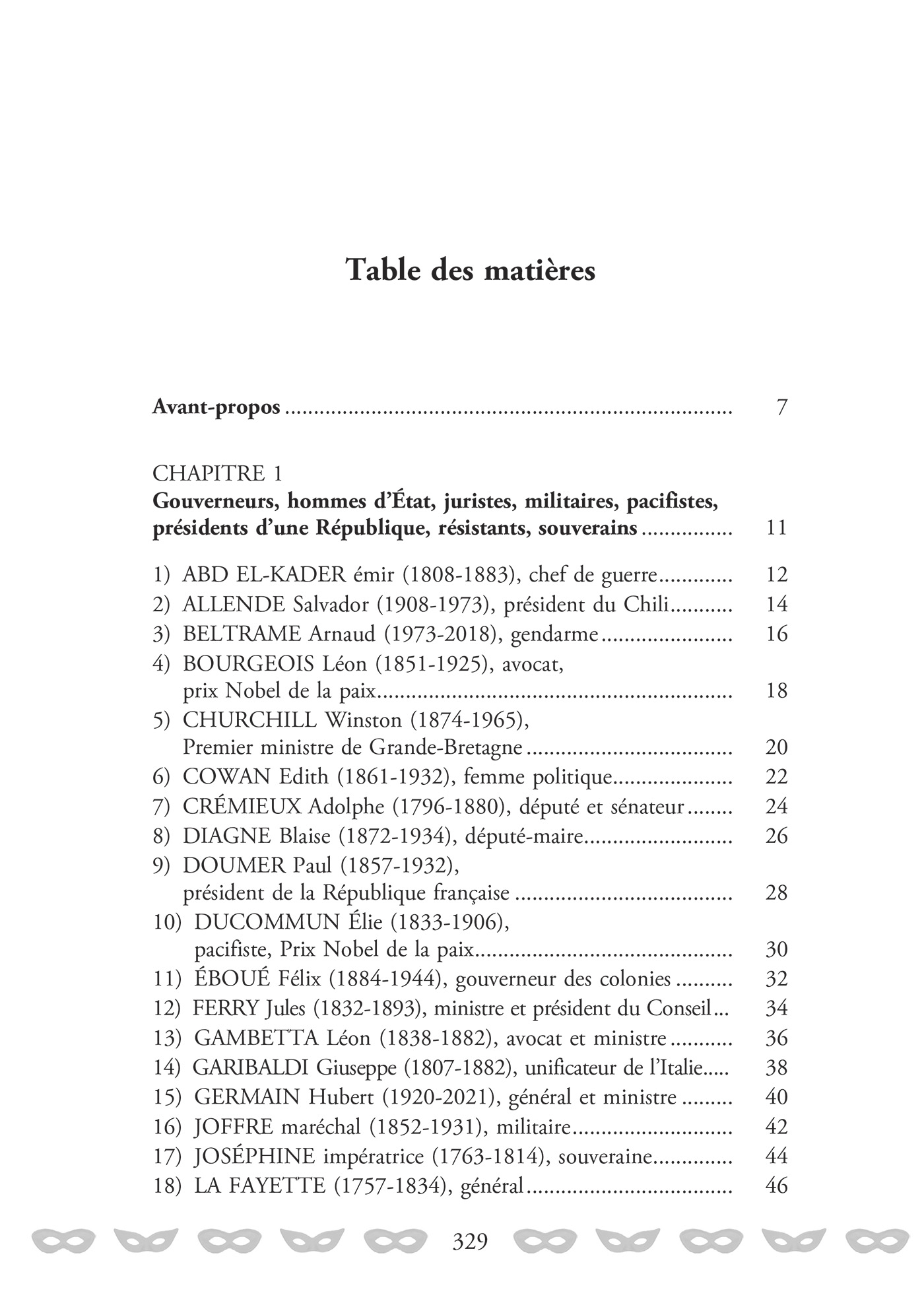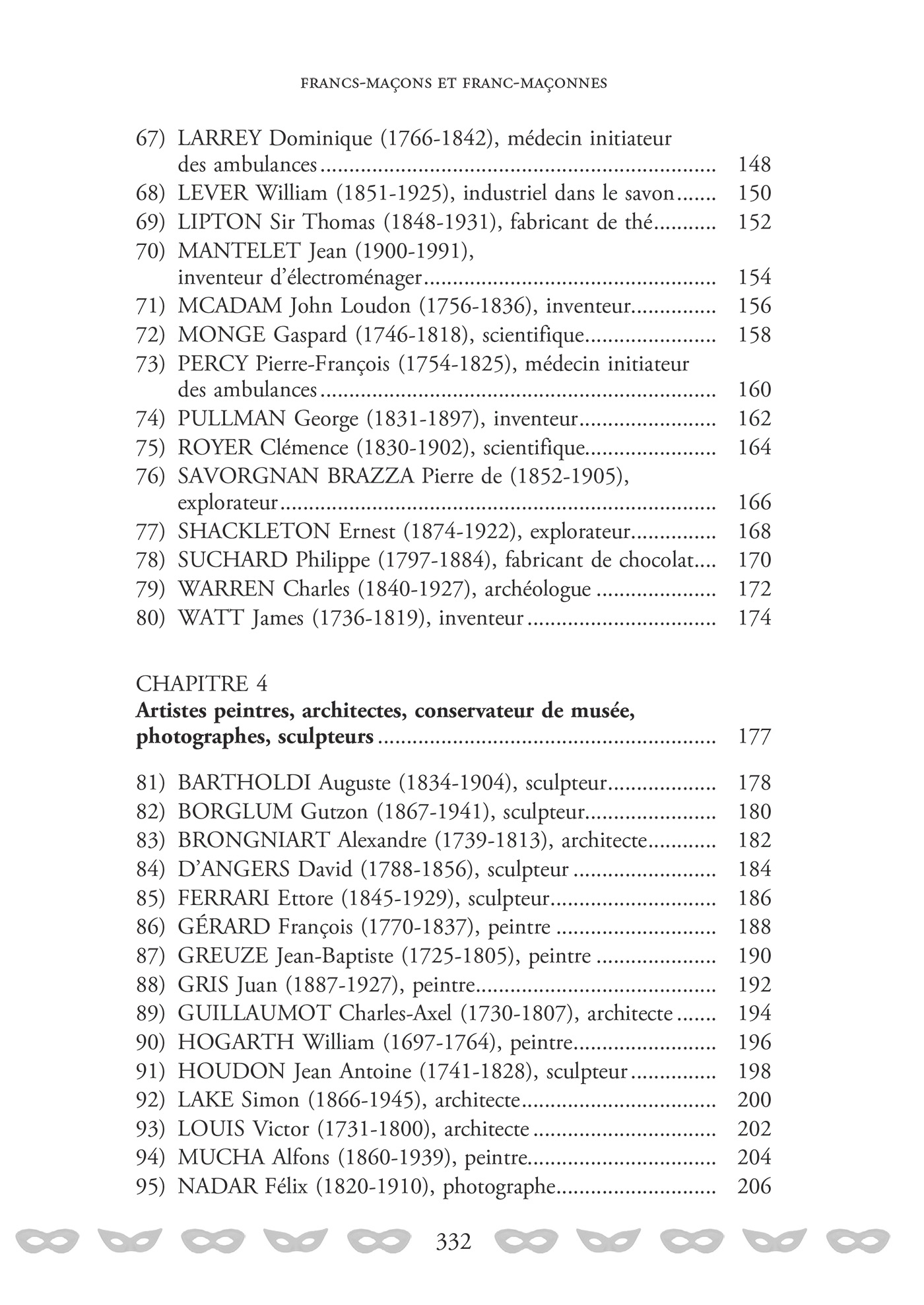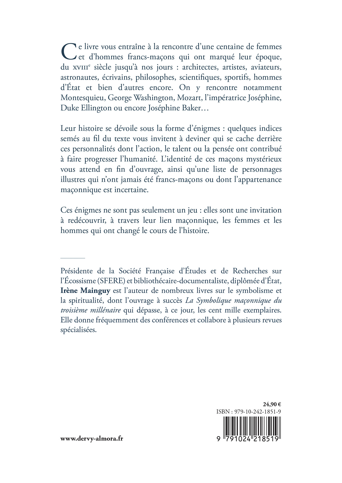 Ce livre vous entraîne à la rencontre d’une centaine de femmes et d’hommes francs-maçons qui ont marqué leur époque, du XVIIIe siècle jusqu’à nos jours : architectes, artistes, aviateurs, astronautes, écrivains, philosophes, scientifiques, sportifs, hommes d’État et bien d’autres encore. On y rencontre notamment Montesquieu, George Washington, Mozart, l’impératrice Joséphine, Duke Ellington ou encore Joséphine Baker…