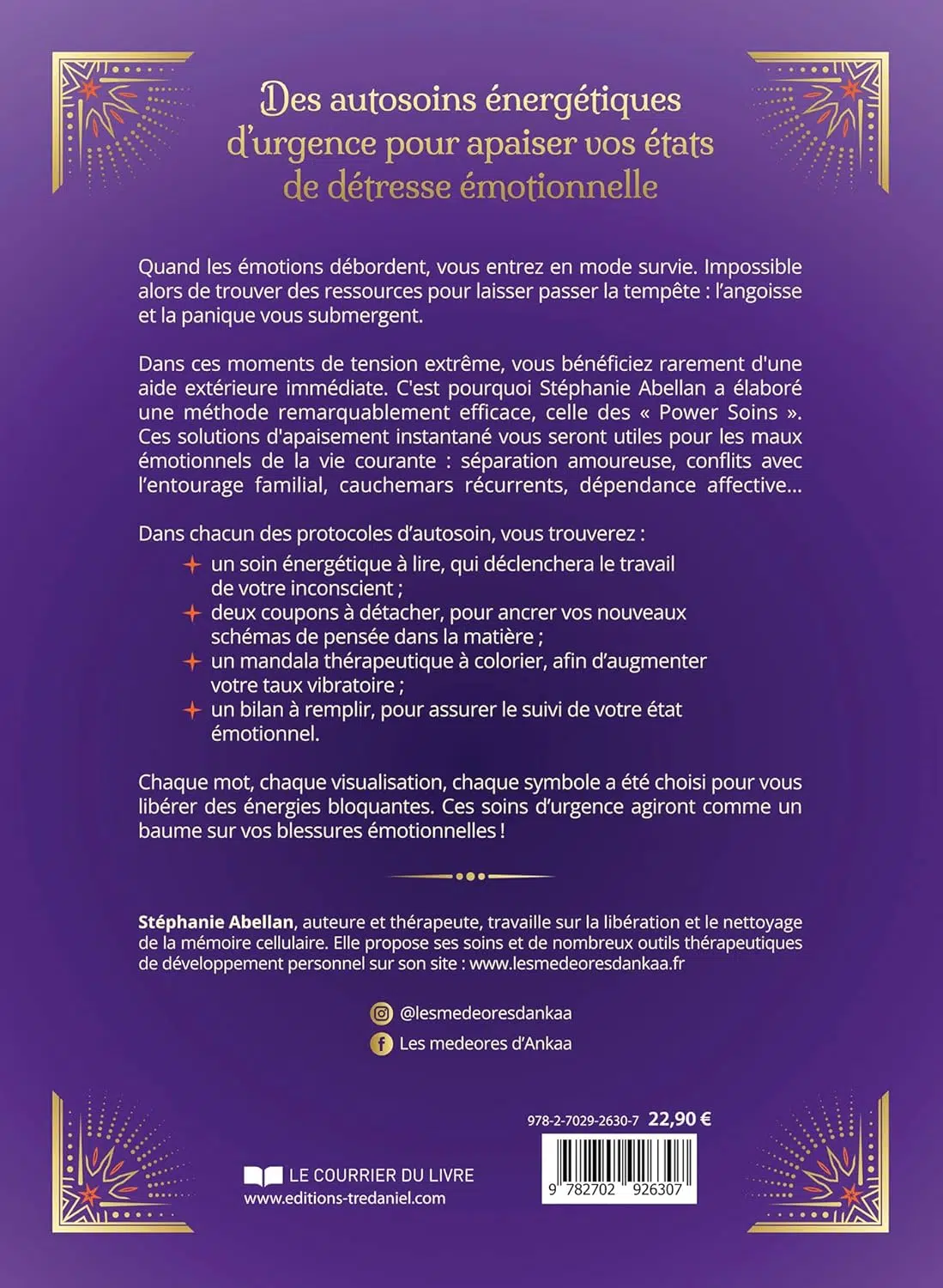 Dans ces moments de tension extrême, vous bénéficiez rarement d'une aide extérieure immédiate. C'est pourquoi Stéphanie Abellan a élaboré une méthode remarquablement efficace, celle des "Power Soins". Ces solutions d’apaisement instantané vous seront utiles pour les maux émotionnels de la vie courante : séparation amoureuse, conflits avec l'entourage familial, cauchemars récurrents, dépendance affective...