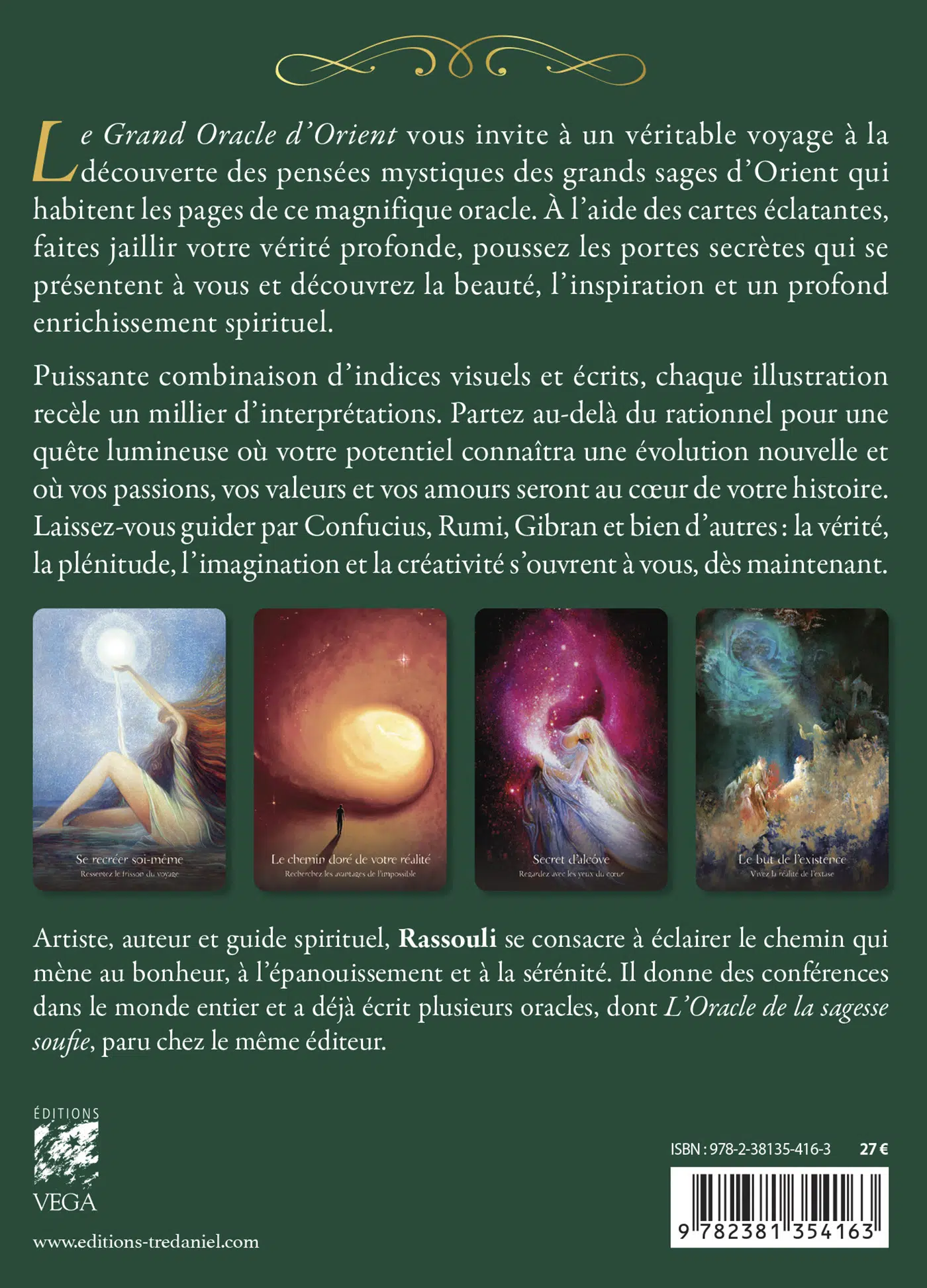 Le Grand Oracle d’Orient vous invite à un véritable voyage à la découverte des pensées mystiques des grands sages d’Orient qui habitent les pages de ce magnifique oracle. À l’aide des cartes éclatantes, faites jaillir votre vérité profonde, poussez les portes secrètes qui se présentent à vous et découvrez la beauté, l’inspiration et un profond enrichissement spirituel.
