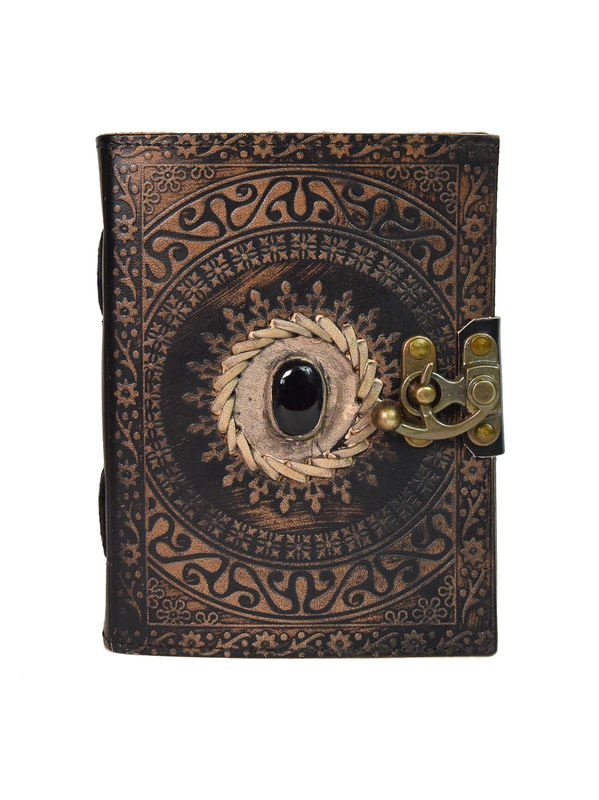 Beau grimoire vierge avec une couverture en cuir repoussé et teinté avec des motifs. Un cabochon d'obsidienne noire y est enchâssé. Un élégant fermoir couleur bronze antique permet de sceller le livre d'une hauteur de 18 cm.