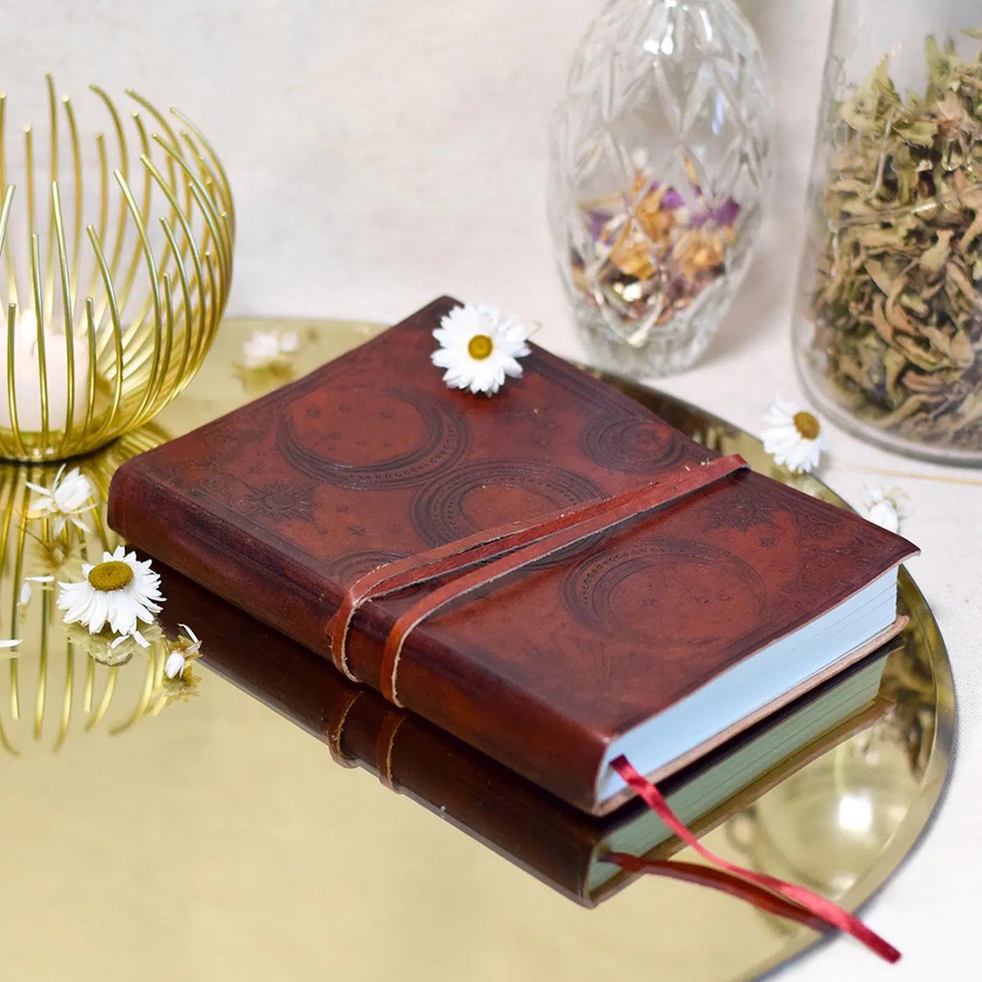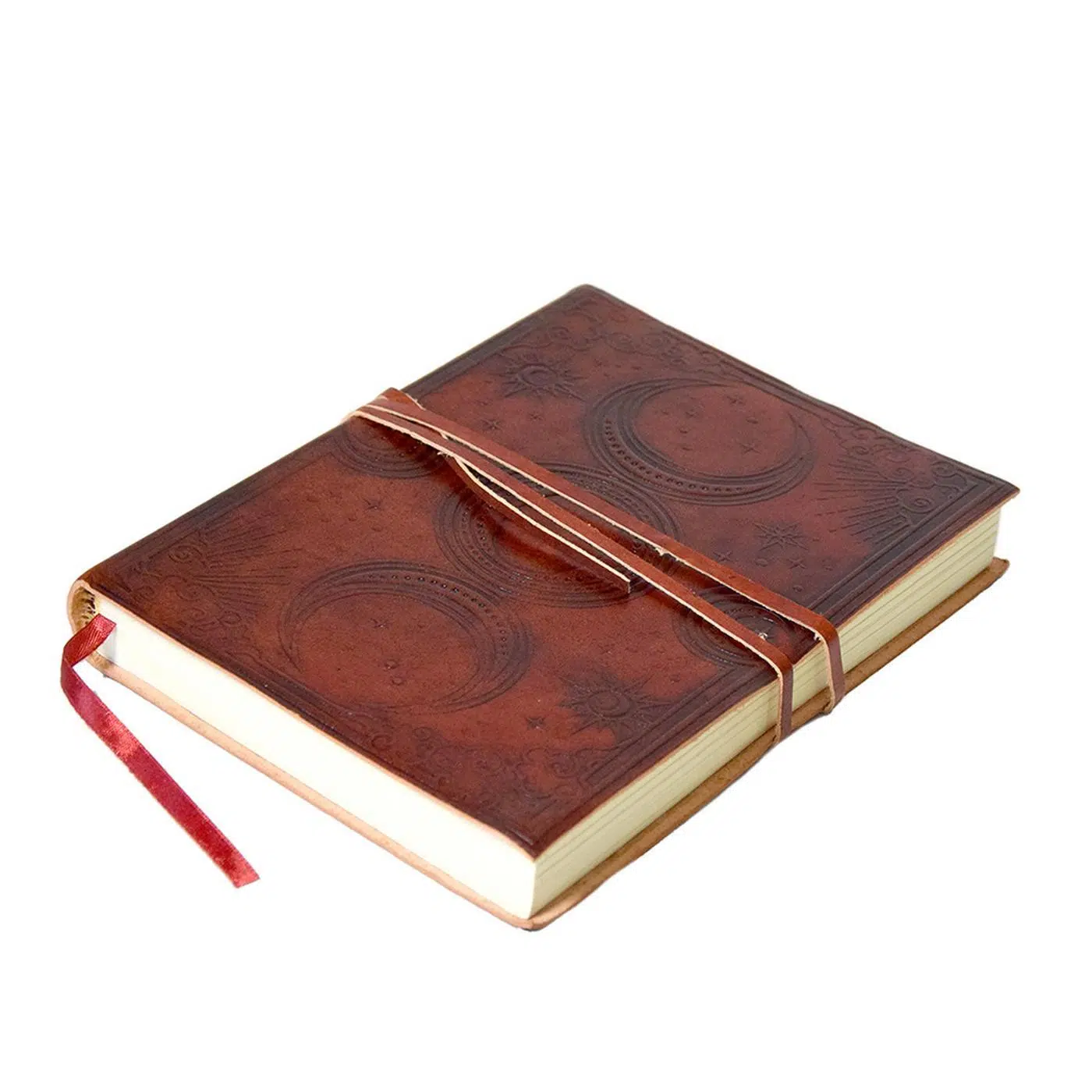 Grimoire et cordon en cuir de buffle, environ 100 pages en papier Khadi traditionnel, certifié FSC. Fabriqué à la main en Inde. Dimensions : A5.