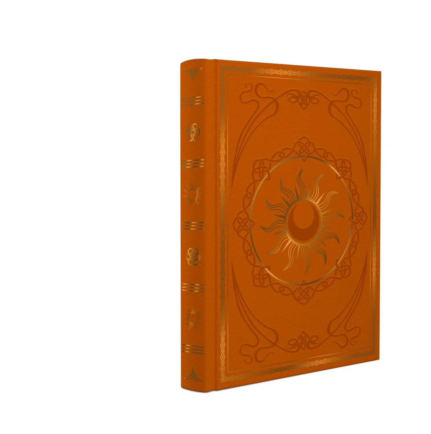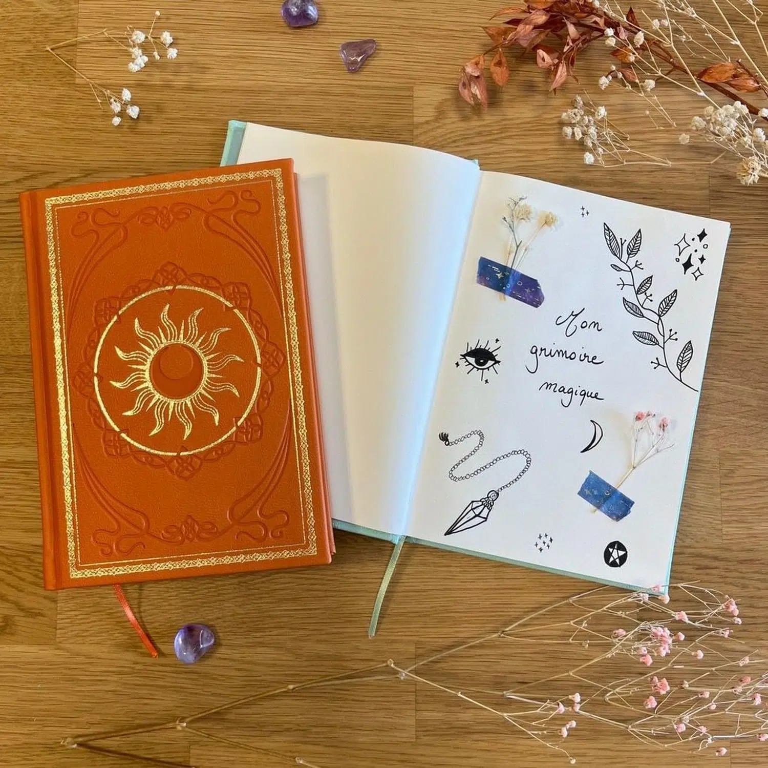 Ce carnet vierge de 220 pages au format A5 (15 x 21) et à la couverture rigide, en similicuir orangé et ornée de dorures, deviendra votre compagnon idéal en tant que grimoire de pratique ou en tant que compagnon de route pour noter tout ce que vous souhaitez.