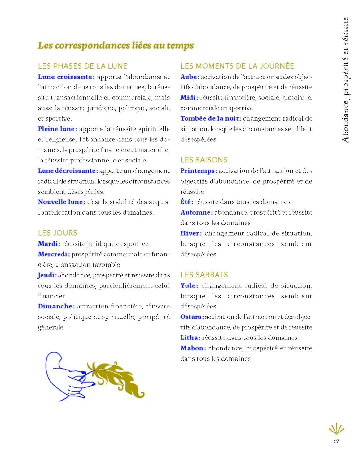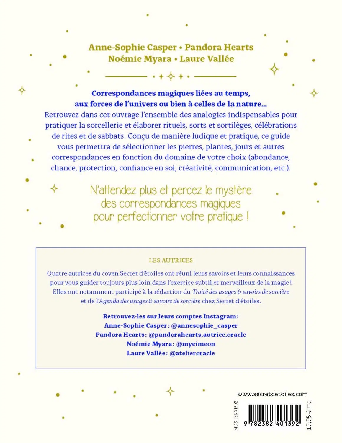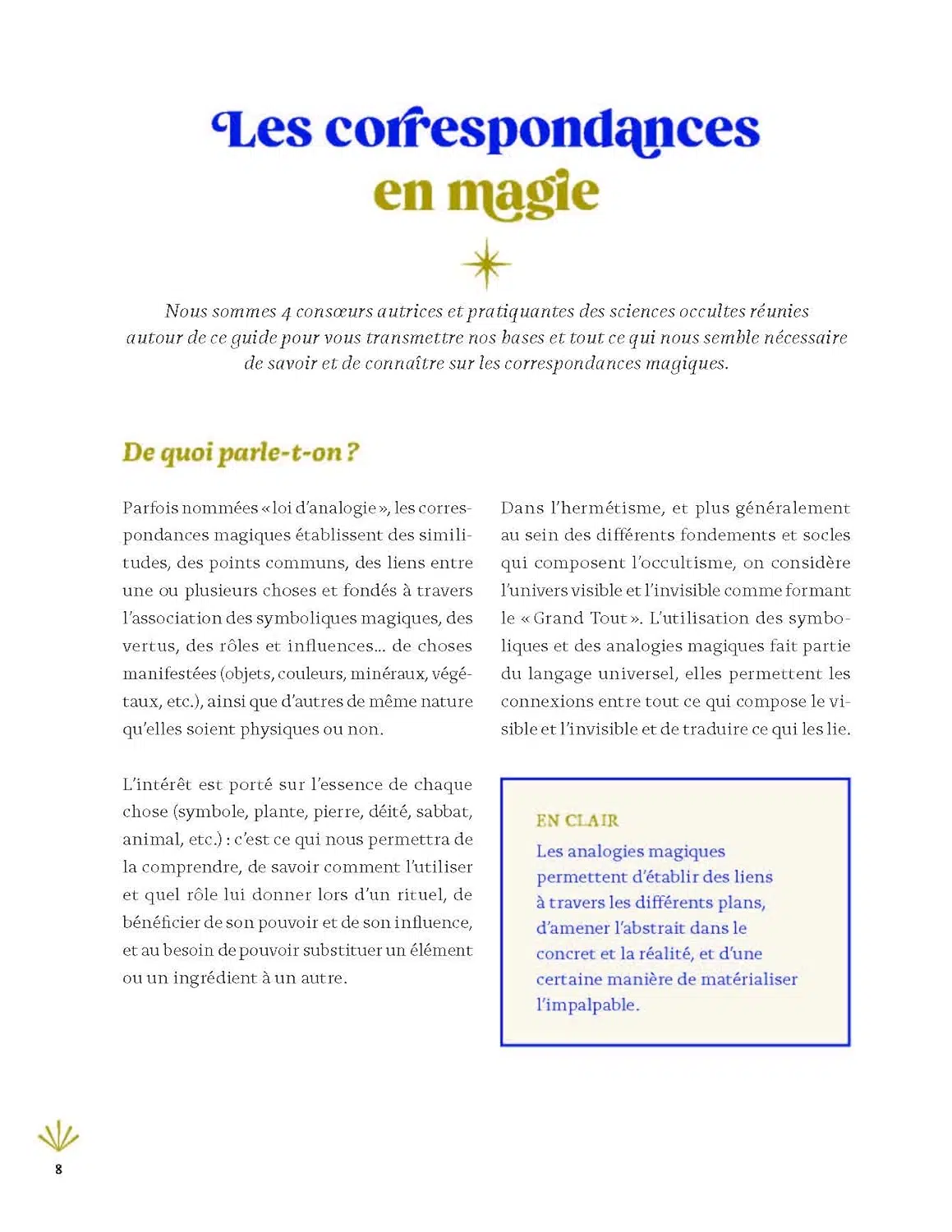 Correspondances magiques liées au temps, aux forces de l’univers ou bien à celles de la nature… Retrouvez dans cet ouvrage l’ensemble des analogies indispensables pour pratiquer la sorcellerie et élaborer rituels, sorts et sortilèges, célébrations de rites et de sabbats. Conçu de manière ludique et pratique, ce guide vous permettra de sélectionner les pierres, plantes, jours et autres correspondances en fonction du domaine de votre choix (abondance, chance, protection, confiance en soi, créativité, communication, etc.).