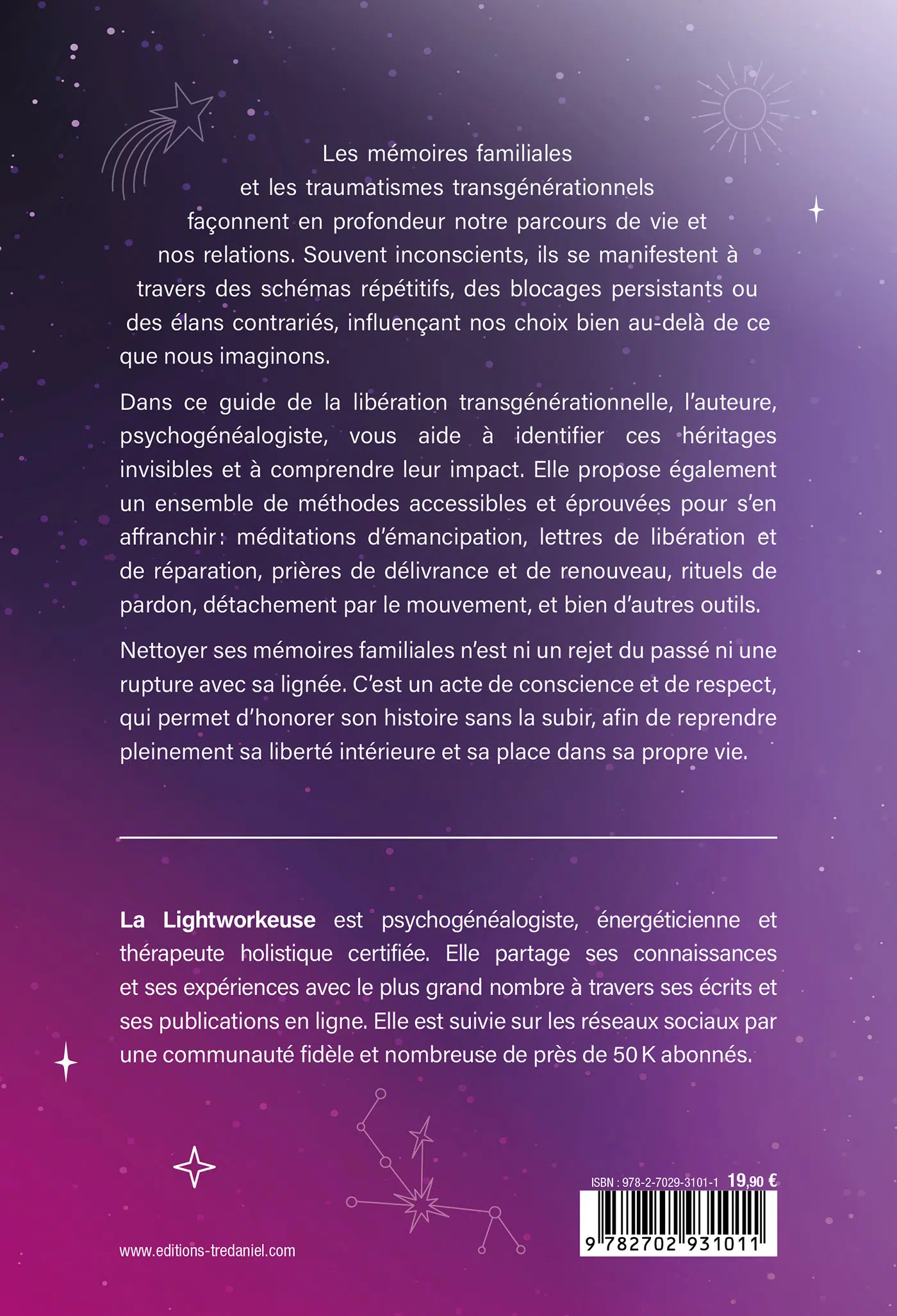 Dans ce guide de la libération transgénérationnelle, l’auteure, psychogénéalogiste, vous aide à identifier ces « héritages invisibles » et à comprendre leur impact. Elle propose également un ensemble de méthodes accessibles et éprouvées pour s’en affranchir : méditations d’émancipation, lettres de libération et de réparation, prières de délivrance et de renouveau, rituels de pardon, détachement par le mouvement, et bien d’autres outils.