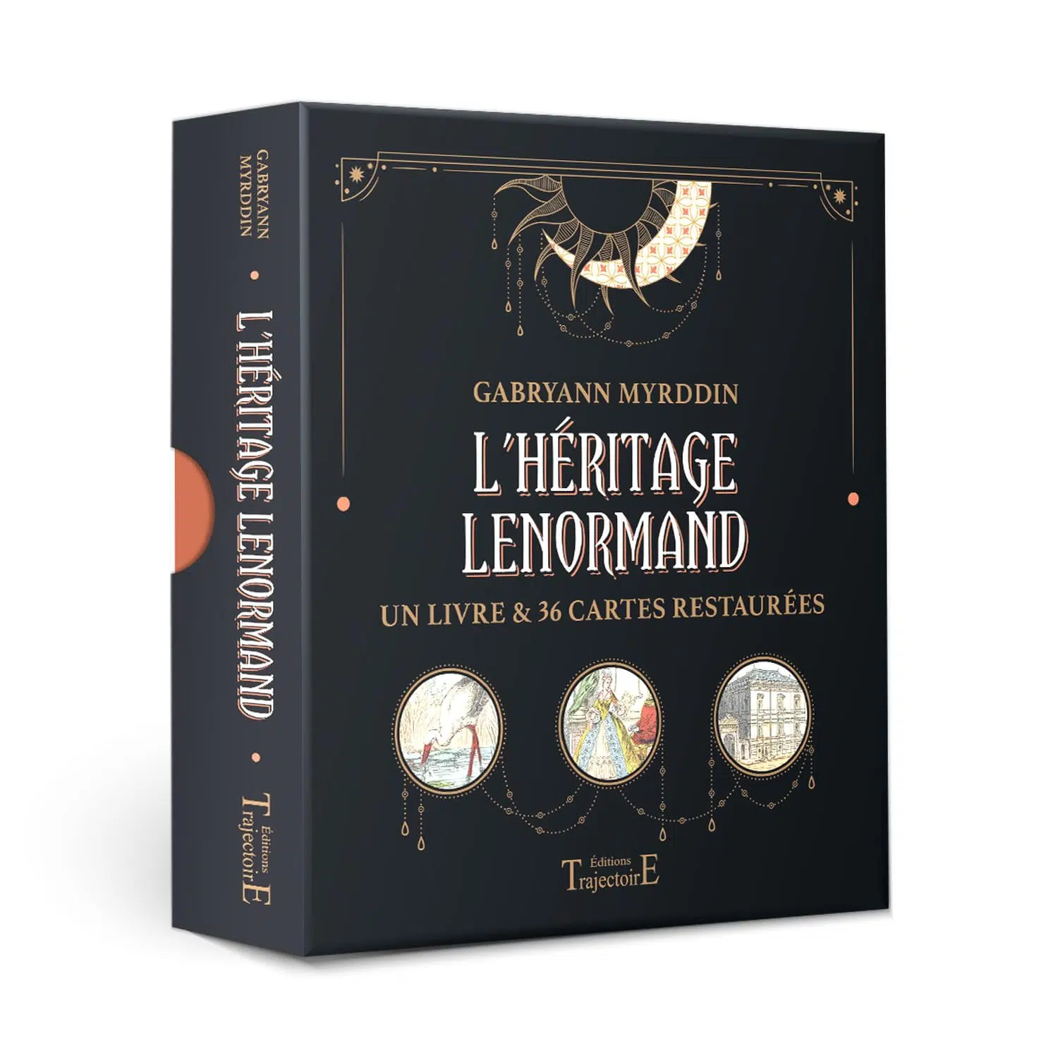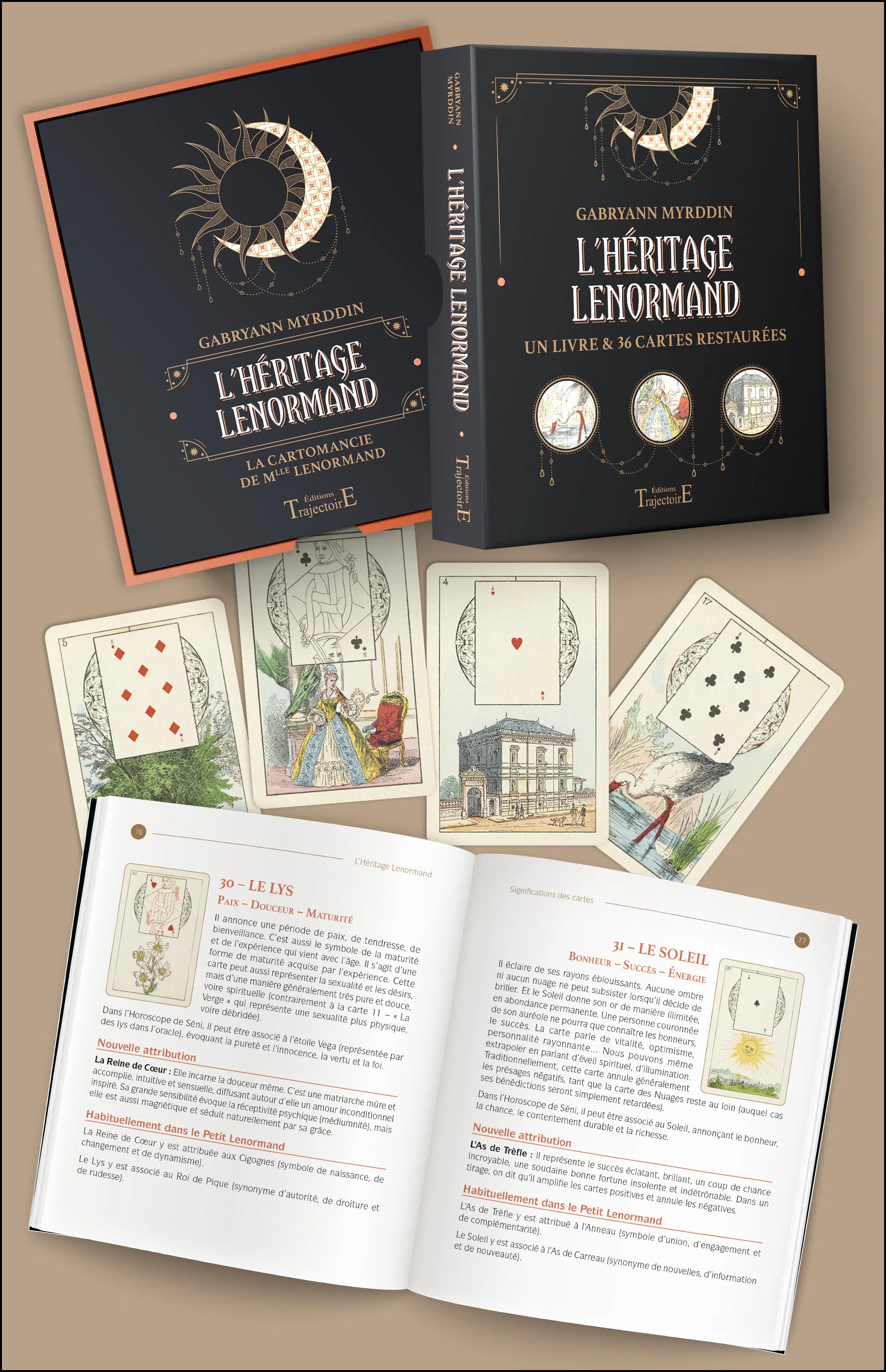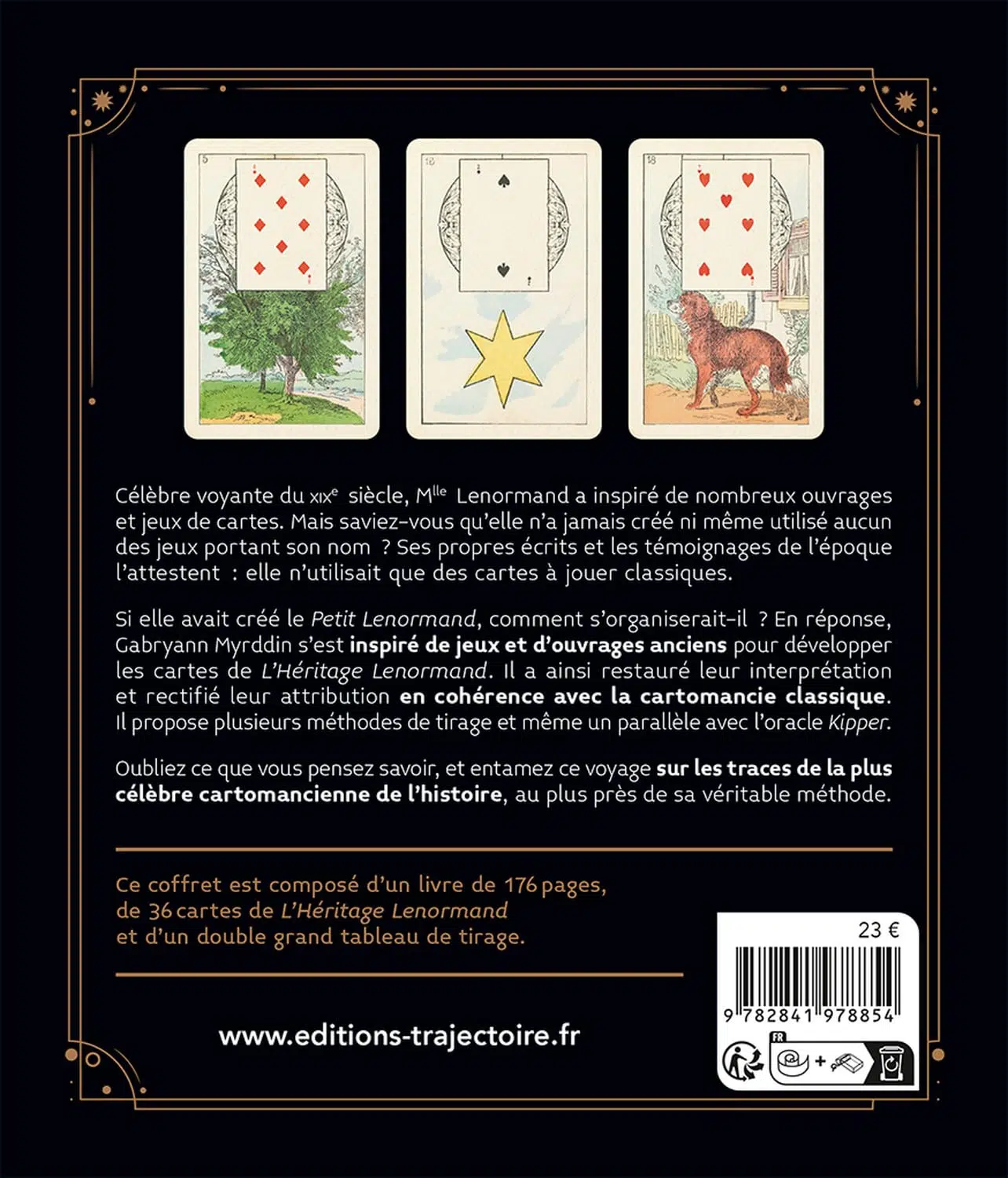 Dans ce coffret, Gabryann Myrddin se penche sur le célèbre Petit Lenormand. Attribué à tort à Mlle Lenormand (pour des raisons commerciales) ce jeu est associé à des cartes classiques, mais différemment de la méthode qu’elle utilisait en réalité.