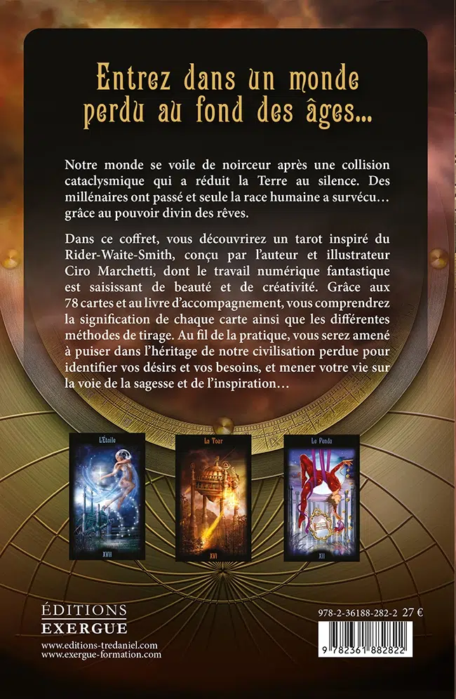 Dans ce coffret, vous découvrirez un tarot inspiré du Rider-Waite-Smith, conçu par l’auteur et illustrateur Ciro Marchetti, dont le travail numérique fantastique est saisissant de beauté et de créativité. Grâce aux 78 cartes d'enseignement et au livre d’accompagnement, vous comprendrez la signification de chaque carte ainsi que les différentes méthodes de tirage. Au fil de la pratique, vous serez amené à puiser dans l’héritage de notre civilisation perdue pour identifier vos désirs et vos besoins, et mener votre vie sur la voie de la sagesse et de l’inspiration…